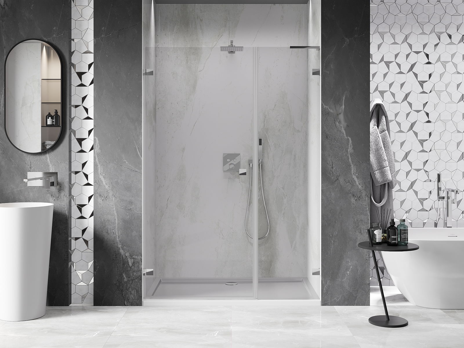 Praktická a pohodlná rukoväť je vyrobená z odolného a pevného kovu. Moderný tvar v kombinácii s povrchovou úpravou prispôsobenou farbe profilov dodáva celku moderný a štýlový vzhľad, zdôrazňujúc estetiku každej kúpeľne.