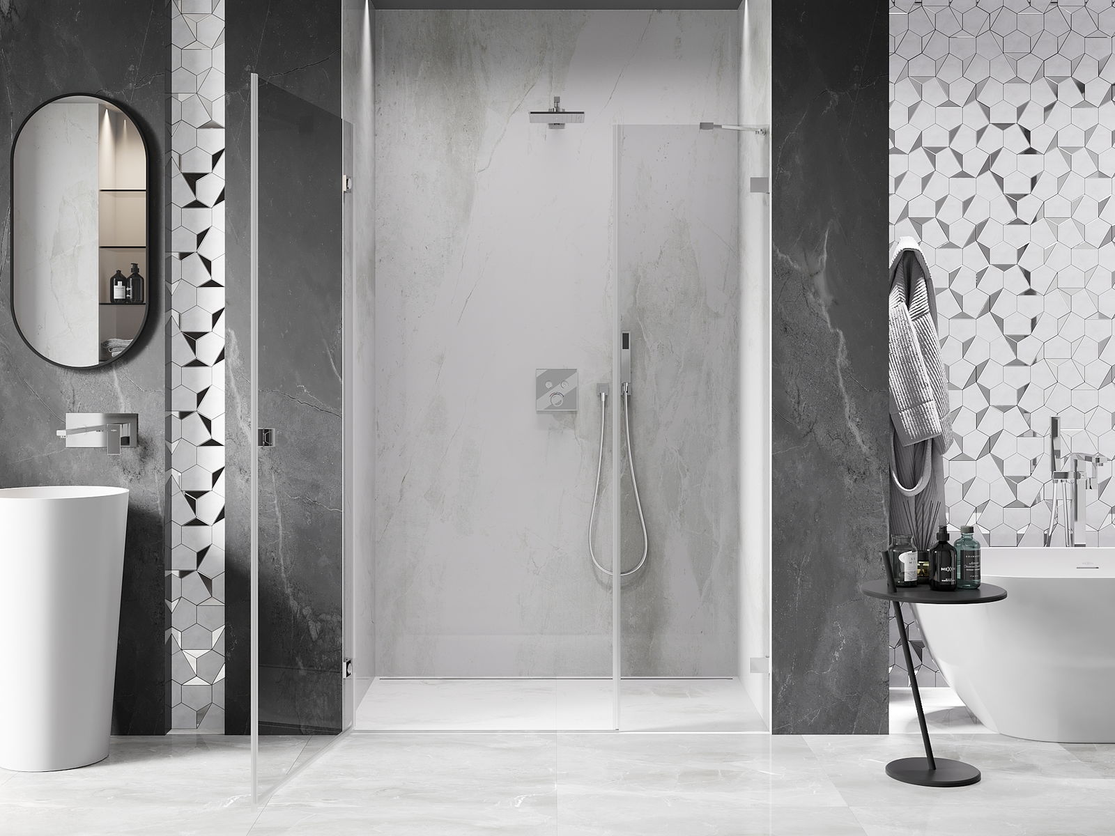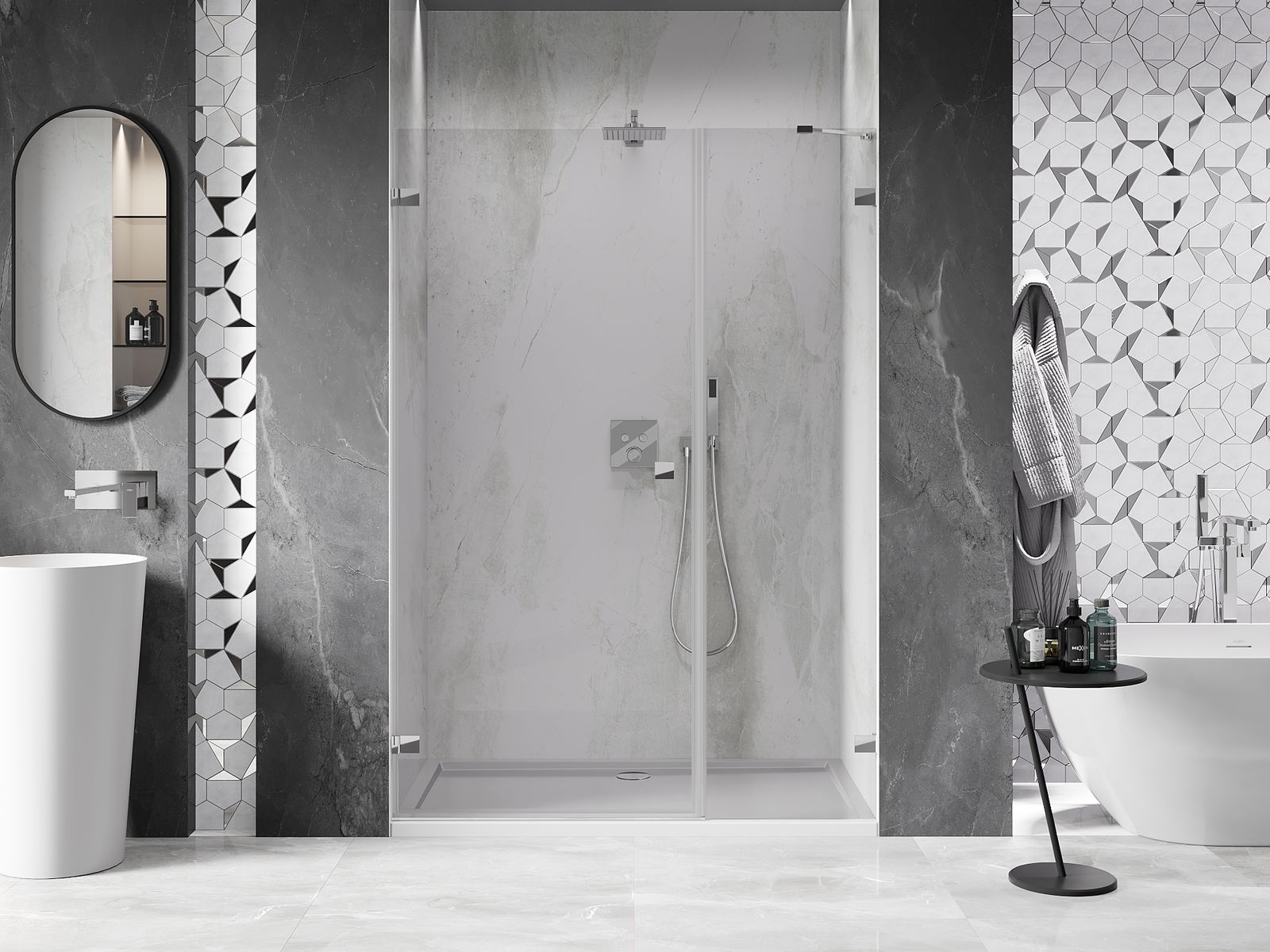 Praktická a pohodlná rukoväť je vyrobená z odolného a pevného kovu. Moderný tvar v kombinácii s povrchovou úpravou prispôsobenou farbe profilov dodáva celku moderný a štýlový vzhľad, zdôrazňujúc estetiku každej kúpeľne.