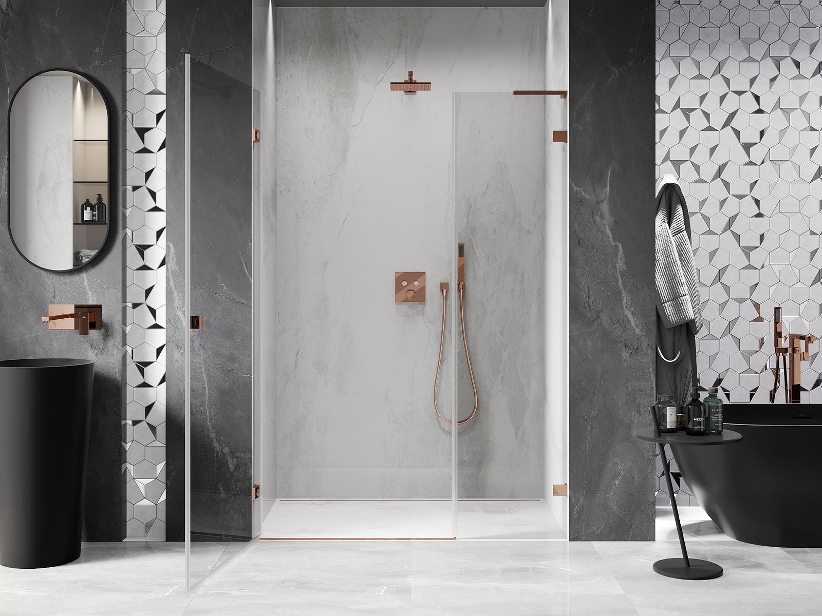 Praktická a pohodlná rukoväť je vyrobená z odolného a pevného kovu. Moderný tvar v kombinácii s povrchovou úpravou prispôsobenou farbe profilov dodáva celku moderný a štýlový vzhľad, zdôrazňujúc estetiku každej kúpeľne.