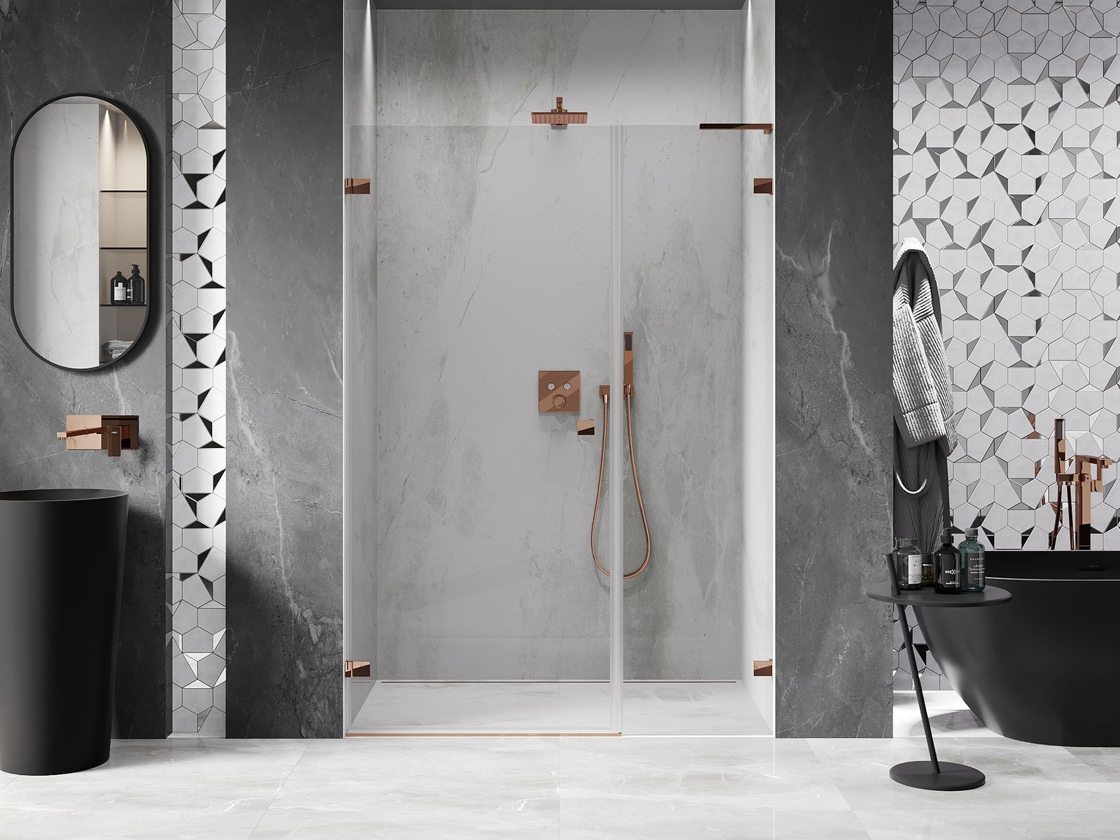 Praktická a pohodlná rukoväť je vyrobená z odolného a pevného kovu. Moderný tvar v kombinácii s povrchovou úpravou prispôsobenou farbe profilov dodáva celku moderný a štýlový vzhľad, zdôrazňujúc estetiku každej kúpeľne.