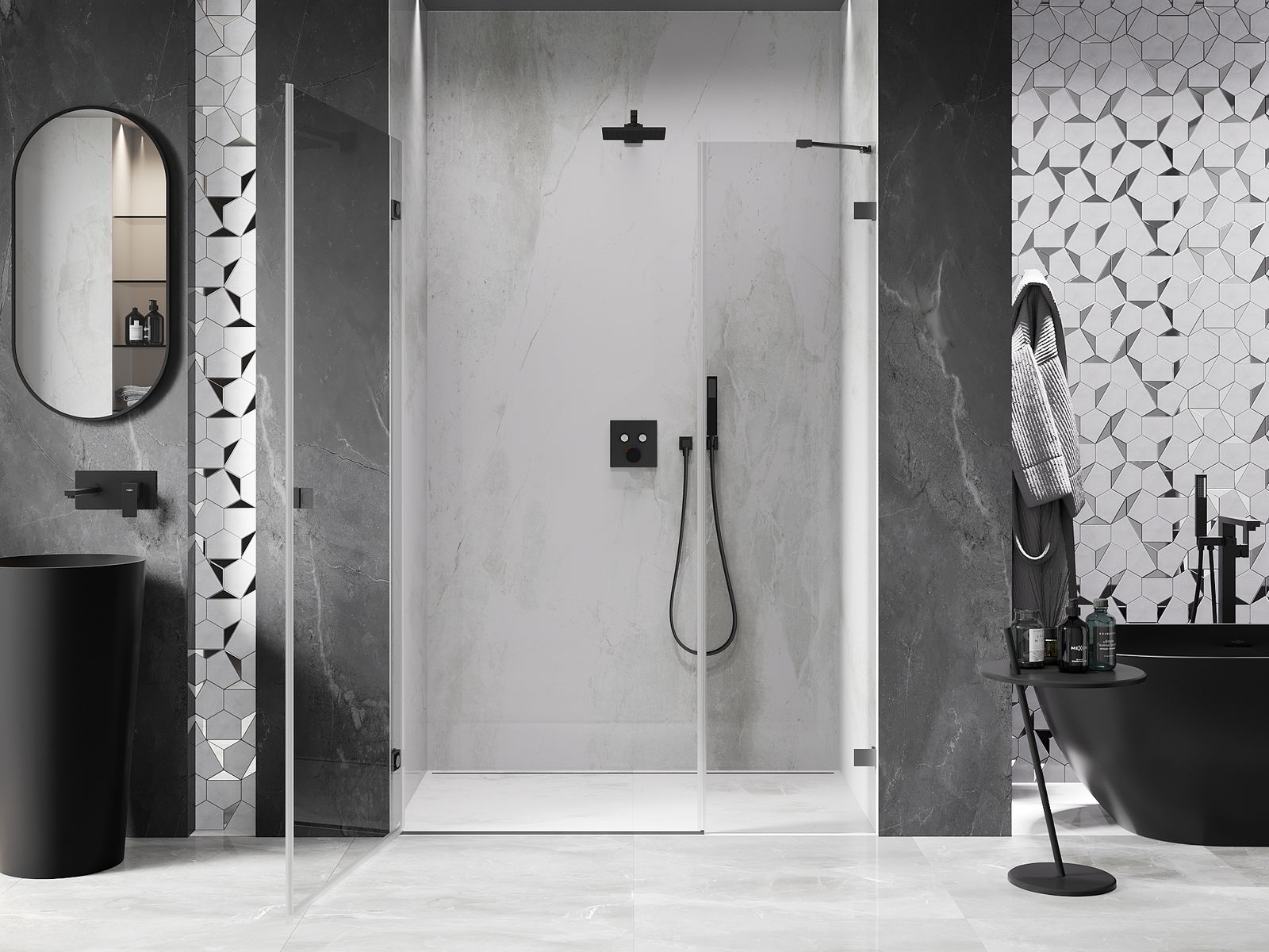 Praktická a pohodlná rukoväť je vyrobená z odolného a pevného kovu. Moderný tvar v kombinácii s povrchovou úpravou prispôsobenou farbe profilov dodáva celku moderný a štýlový vzhľad, zdôrazňujúc estetiku každej kúpeľne.