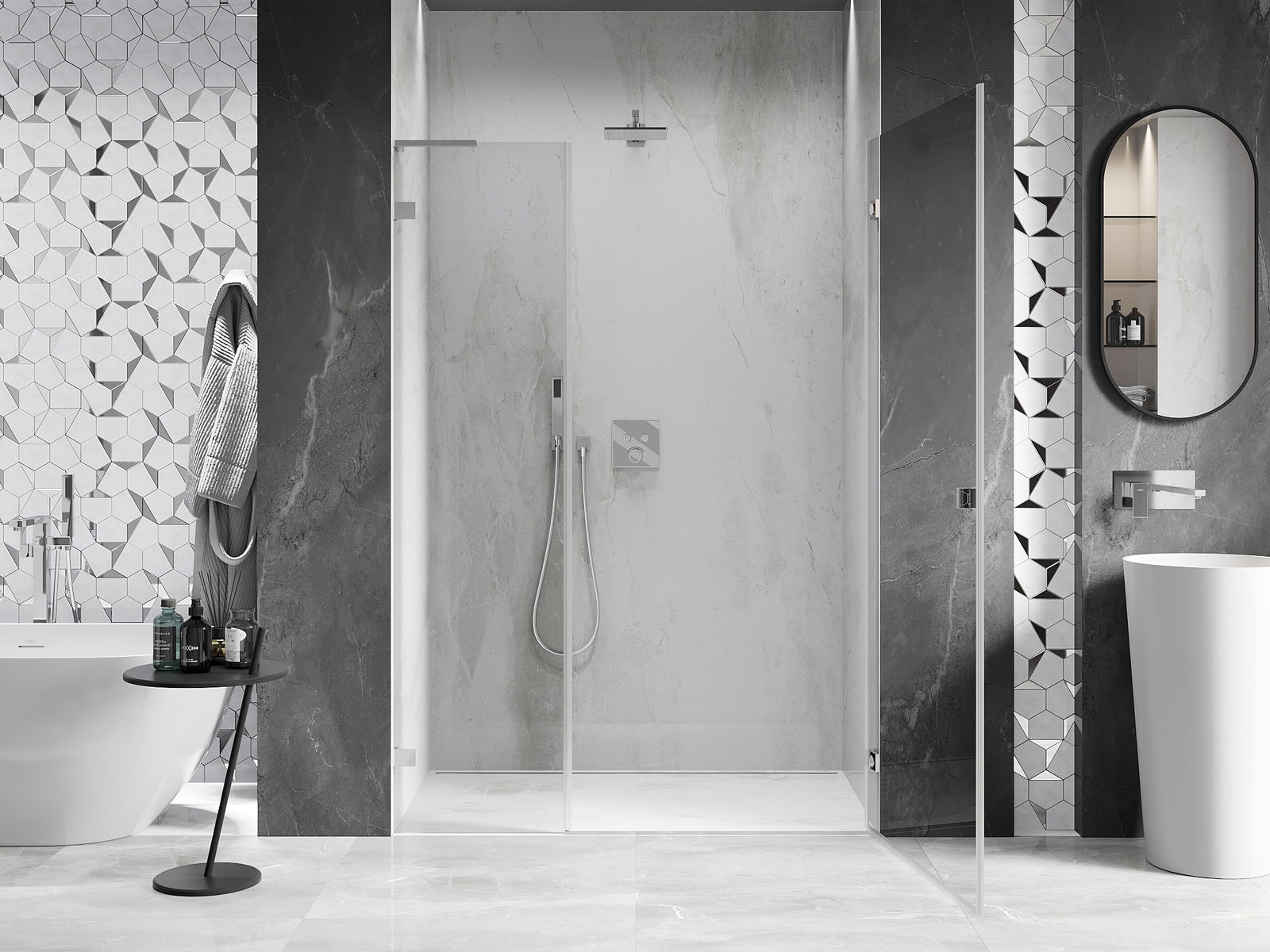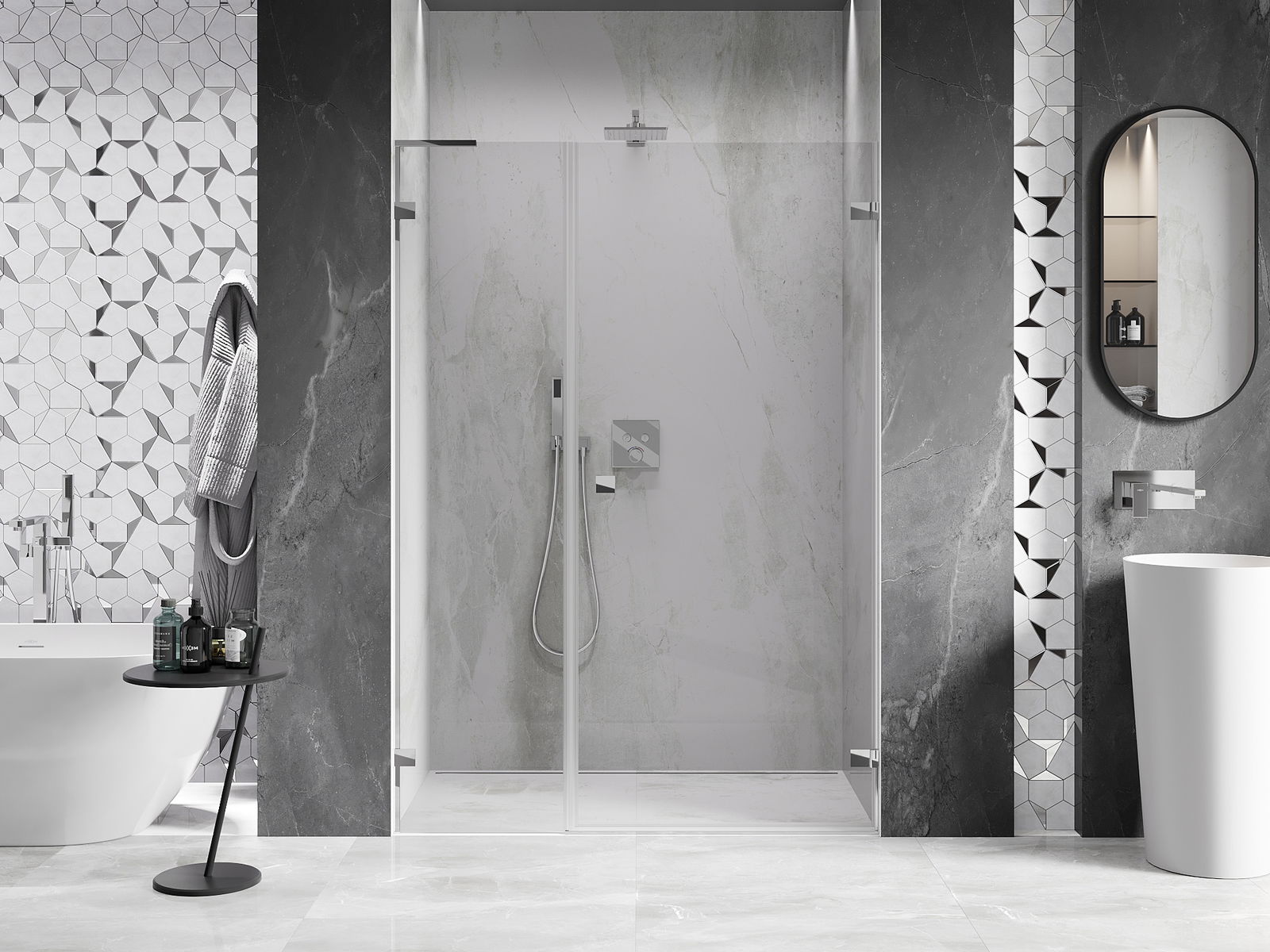 Praktická a pohodlná rukoväť je vyrobená z odolného a pevného kovu. Moderný tvar v kombinácii s povrchovou úpravou prispôsobenou farbe profilov dodáva celku moderný a štýlový vzhľad, zdôrazňujúc estetiku každej kúpeľne.