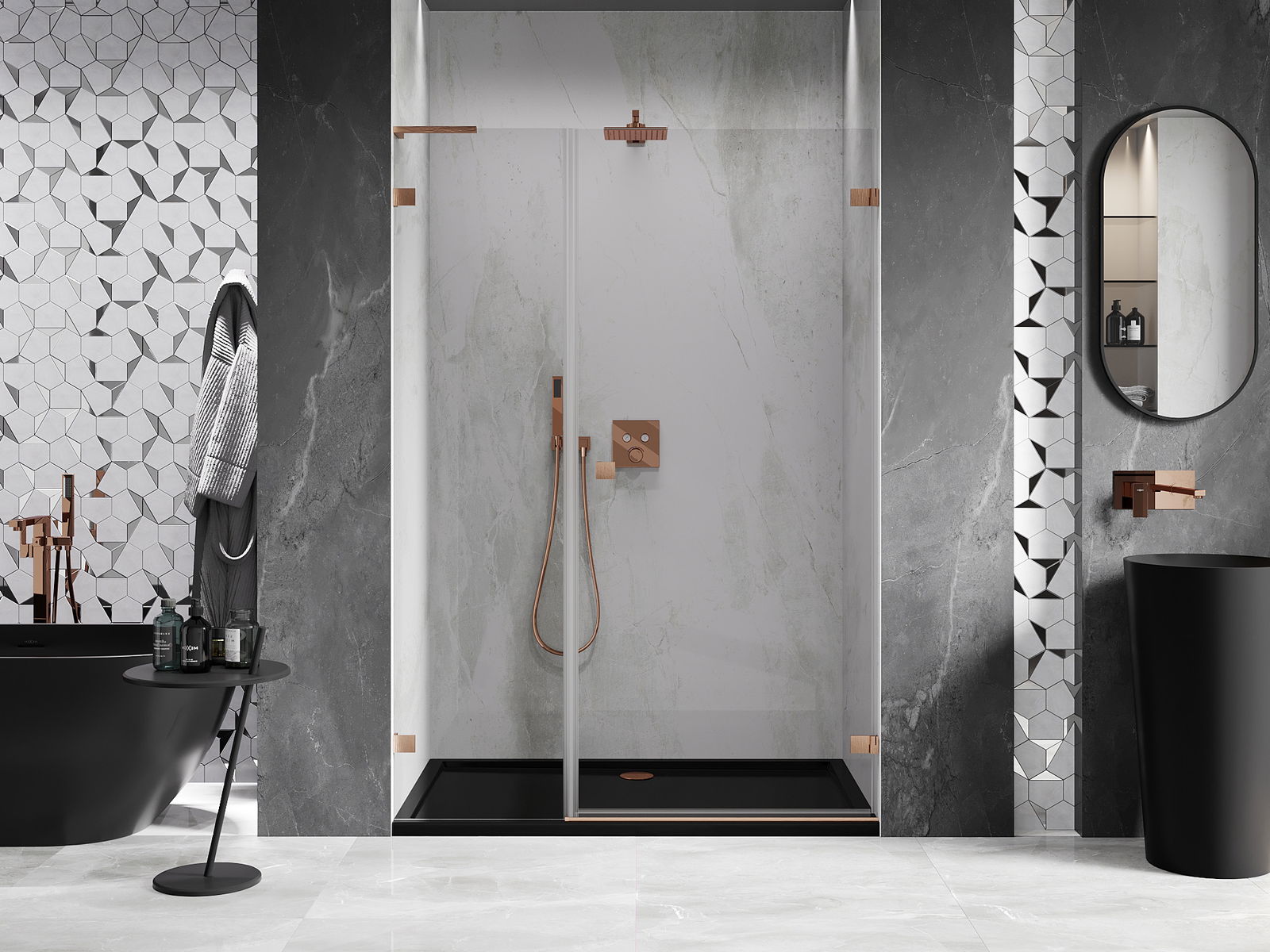 Praktická a pohodlná rukoväť je vyrobená z odolného a pevného kovu. Moderný tvar v kombinácii s povrchovou úpravou prispôsobenou farbe profilov dodáva celku moderný a štýlový vzhľad, zdôrazňujúc estetiku každej kúpeľne.