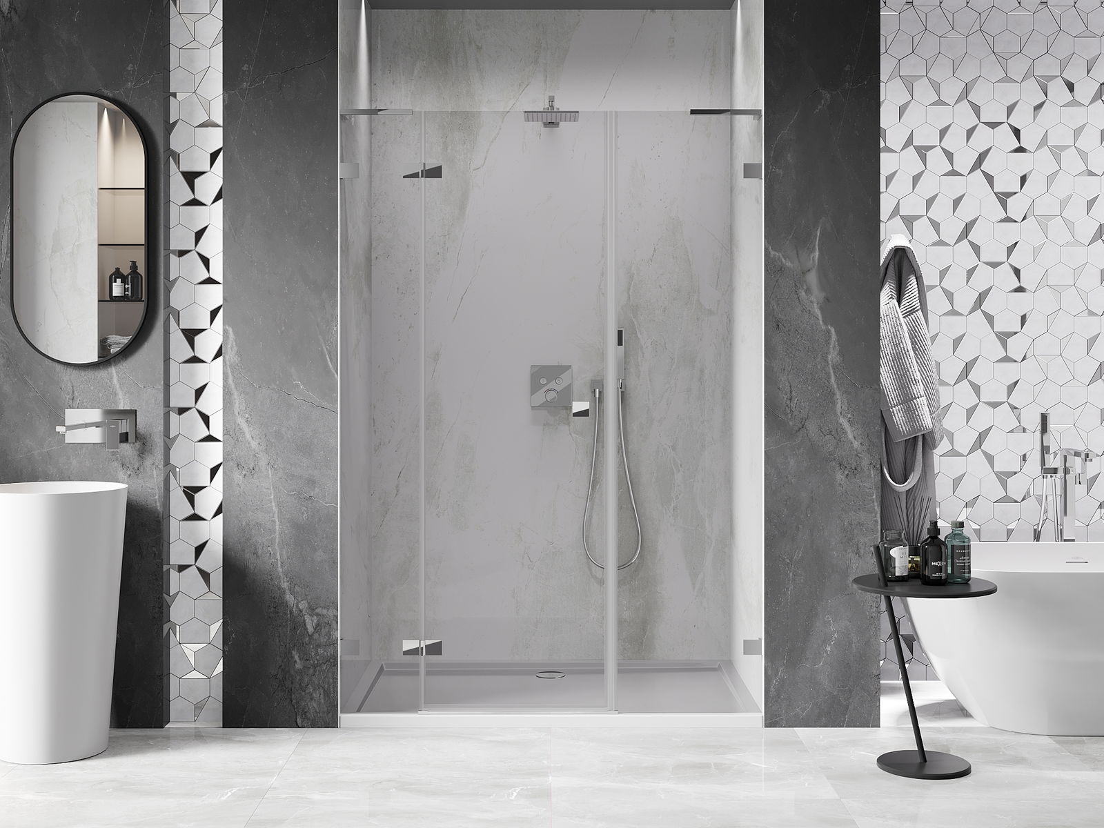 Praktická a pohodlná rukoväť je vyrobená z odolného a pevného kovu. Moderný tvar v kombinácii s povrchovou úpravou prispôsobenou farbe profilov dodáva celku moderný a štýlový vzhľad, zdôrazňujúc estetiku každej kúpeľne.