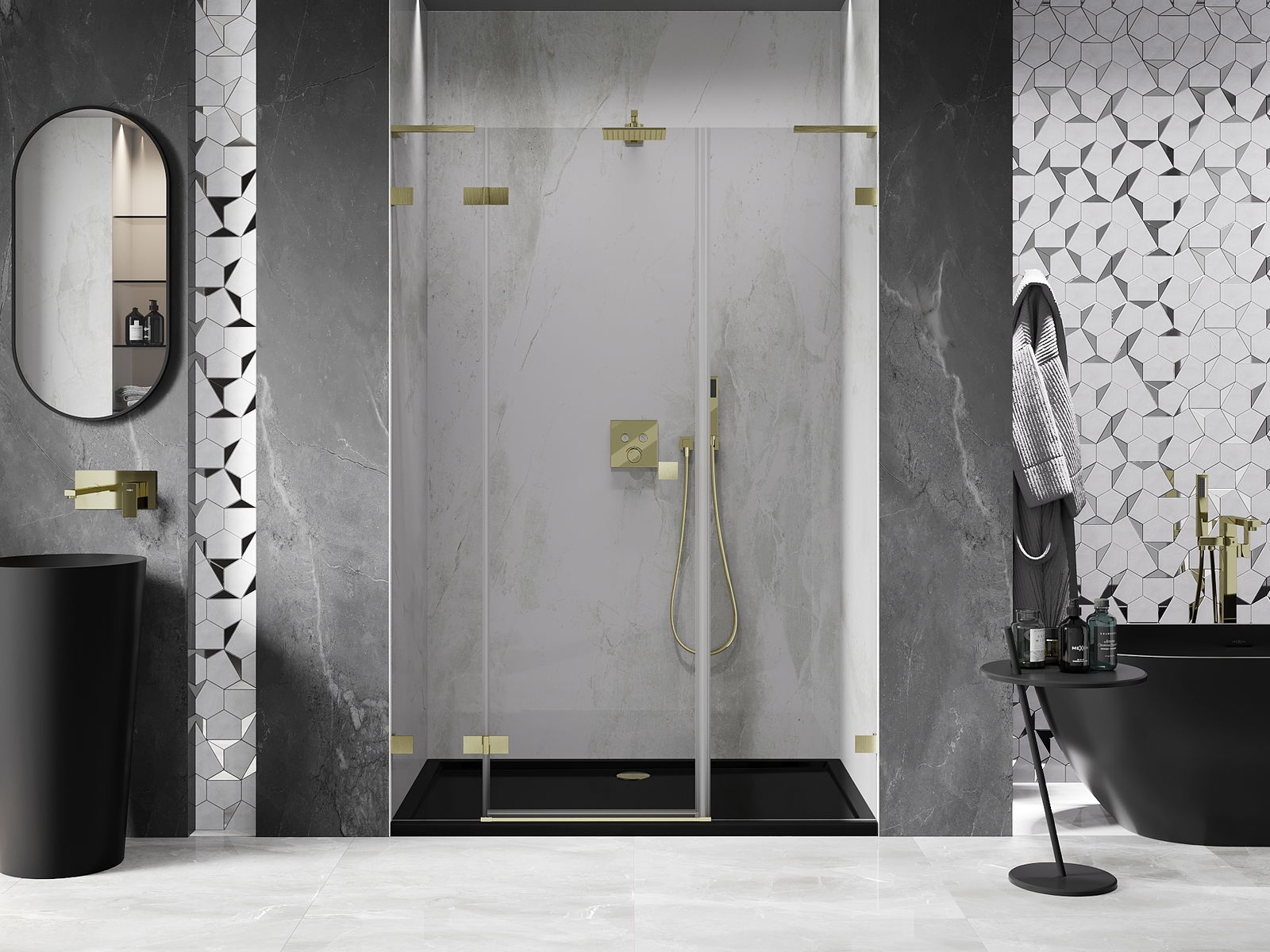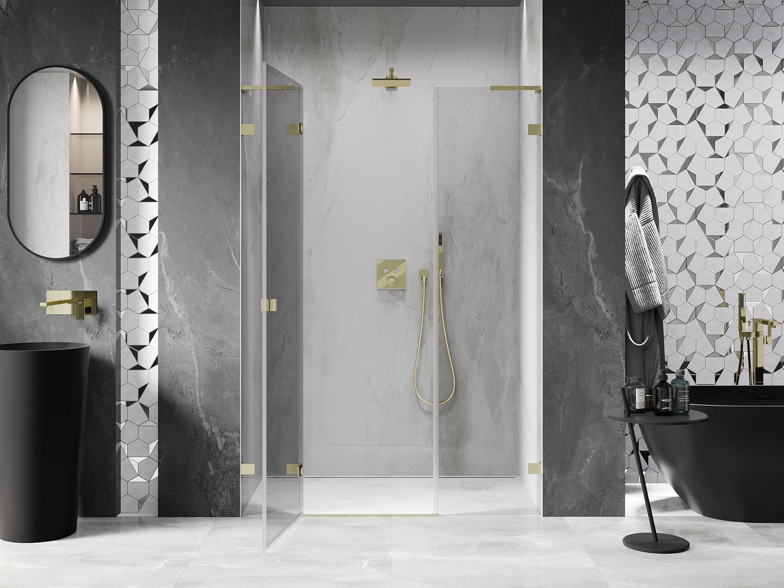 Svorky a závesy boli vyrobené z veľmi odolnej mosadze a navyše vytvárajú zarovnanú tabuľu skla. Je to vynikajúci výber, ktorý spája eleganciu, trvanlivosť a moderný dizajn. Vďaka takýmto riešeniam sprcha získa na estetike a zároveň uľahčujú udržiavanie čistoty.