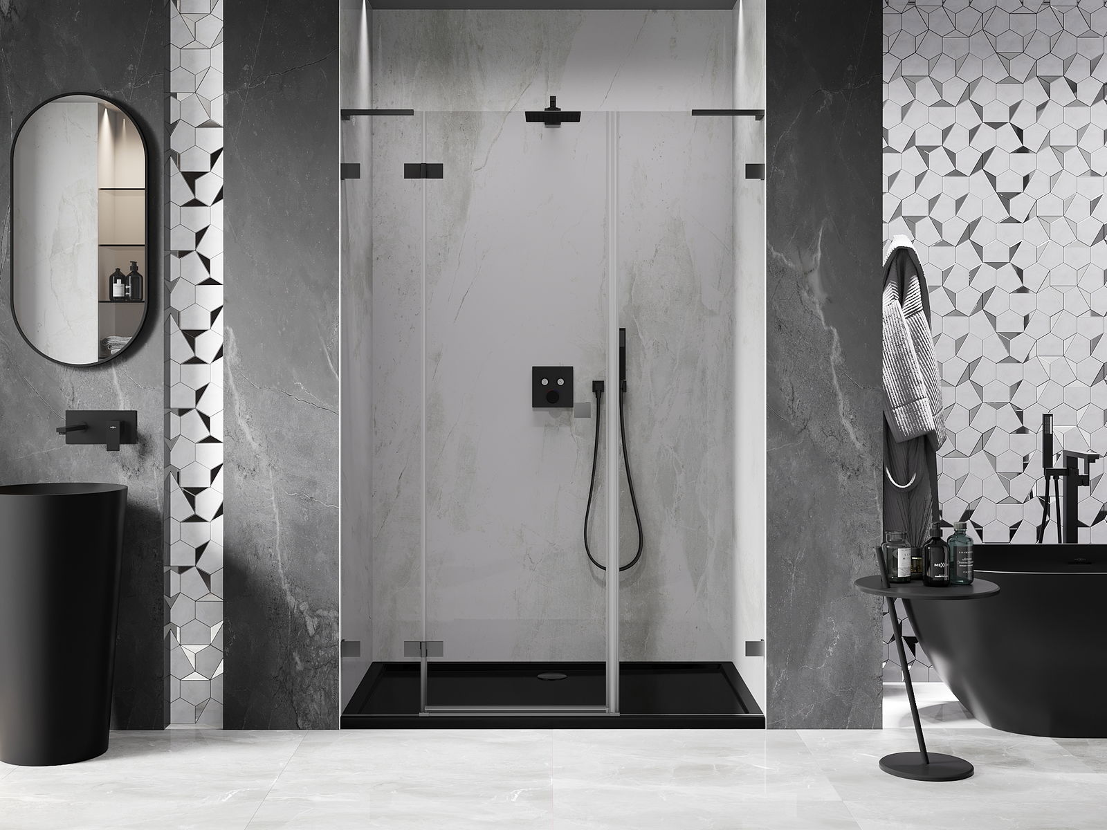 Praktická a pohodlná rukoväť je vyrobená z odolného a pevného kovu. Moderný tvar v kombinácii s povrchovou úpravou prispôsobenou farbe profilov dodáva celku moderný a štýlový vzhľad, zdôrazňujúc estetiku každej kúpeľne.
