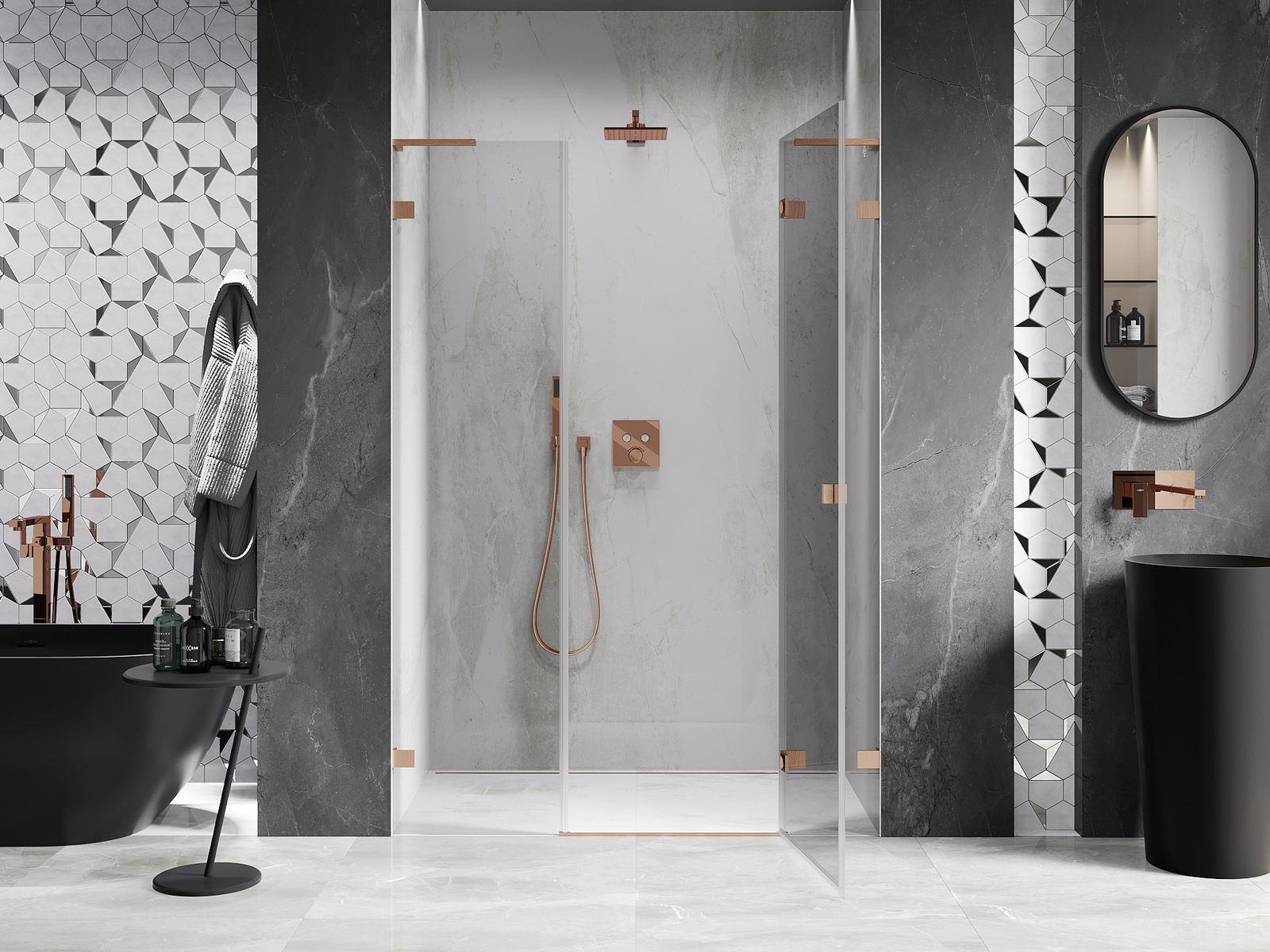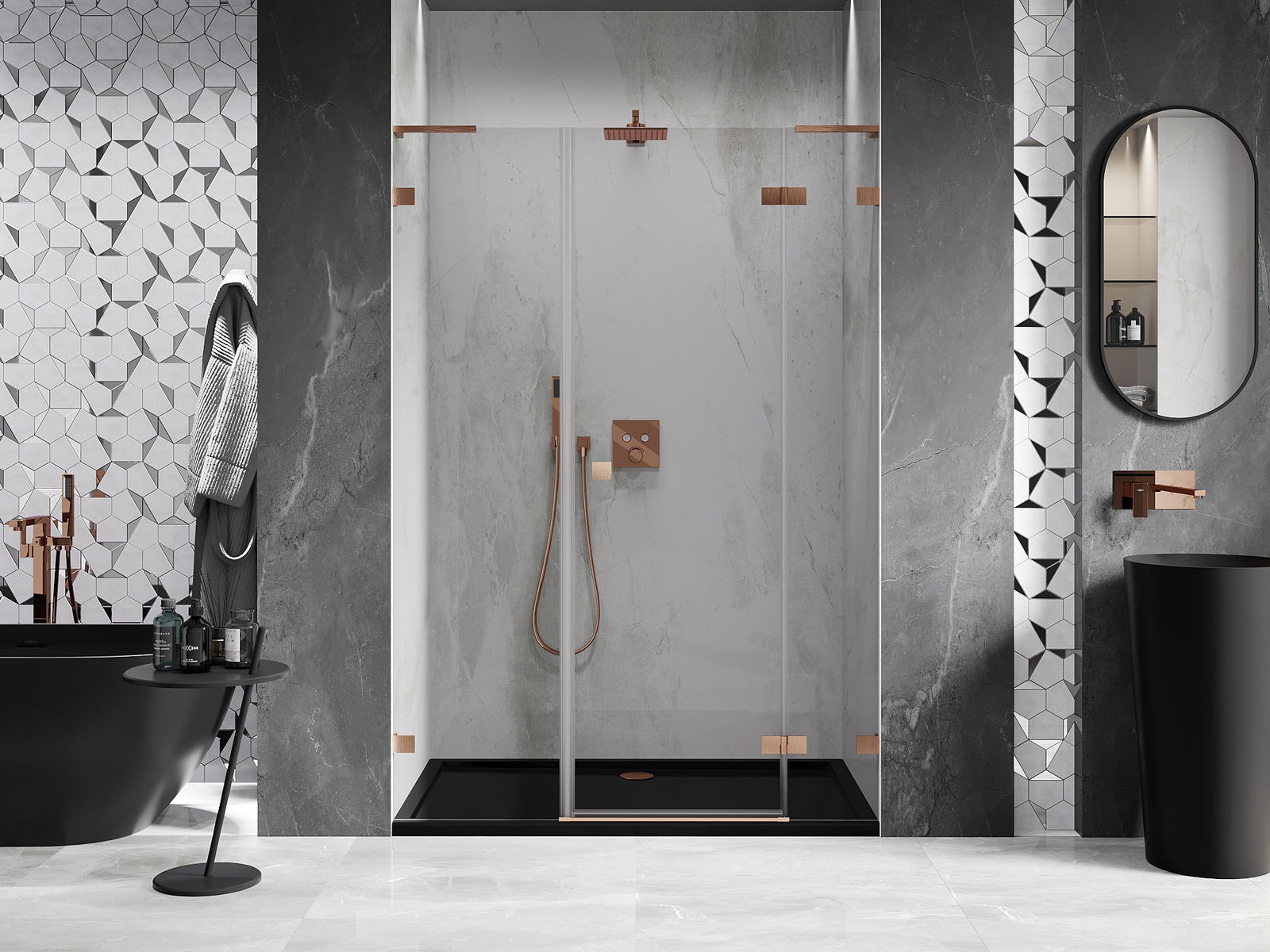 Praktická a pohodlná rukoväť je vyrobená z odolného a pevného kovu. Moderný tvar v kombinácii s povrchovou úpravou prispôsobenou farbe profilov dodáva celku moderný a štýlový vzhľad, zdôrazňujúc estetiku každej kúpeľne.