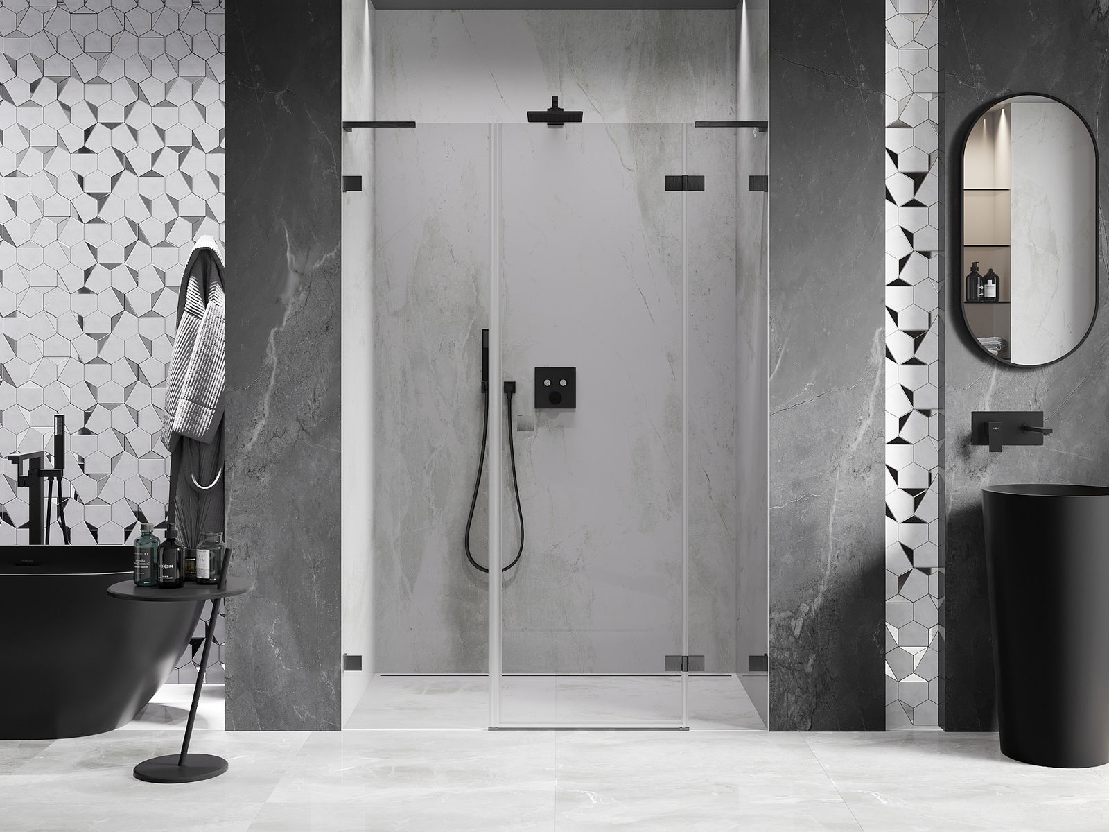 Praktická a pohodlná rukoväť je vyrobená z odolného a pevného kovu. Moderný tvar v kombinácii s povrchovou úpravou prispôsobenou farbe profilov dodáva celku moderný a štýlový vzhľad, zdôrazňujúc estetiku každej kúpeľne.