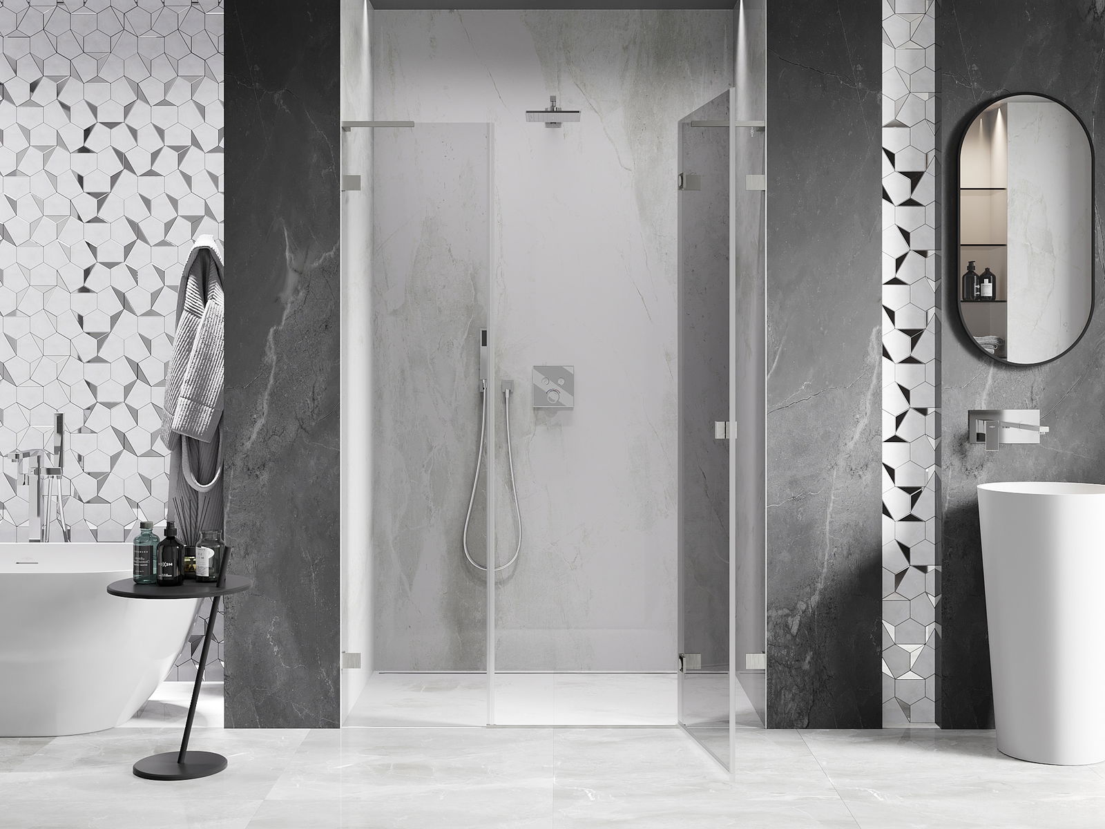 Praktická a pohodlná rukoväť je vyrobená z odolného a pevného kovu. Moderný tvar v kombinácii s povrchovou úpravou prispôsobenou farbe profilov dodáva celku moderný a štýlový vzhľad, zdôrazňujúc estetiku každej kúpeľne.