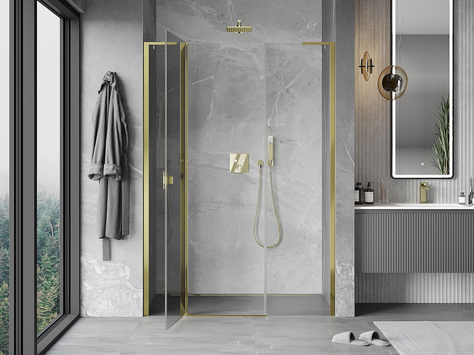 Praktická a pohodlná rukoväť je vyrobená z odolného a pevného kovu. Moderný tvar v kombinácii s povrchovou úpravou prispôsobenou farbe profilov dodáva celku moderný a štýlový vzhľad, zdôrazňujúc estetiku každej kúpeľne.