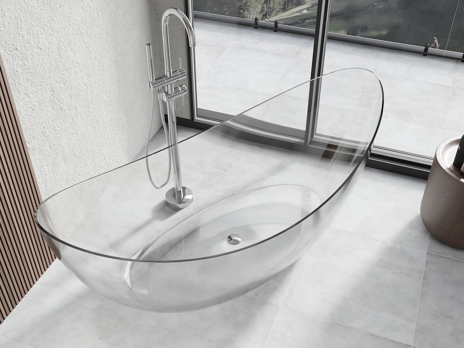 Je to moderný materiál, ktorý kombinuje elegantný vzhľad s vysokou trvanlivosťou. Je odolný proti mechanickému poškodeniu, ľahko sa čistí a je príjemný na dotyk. Transparentná forma a tenký okraj vane jej dodávajú ľahkosť a unikátny charakter, čím vytvárajú efektný prvok v usporiadaní kúpeľne.