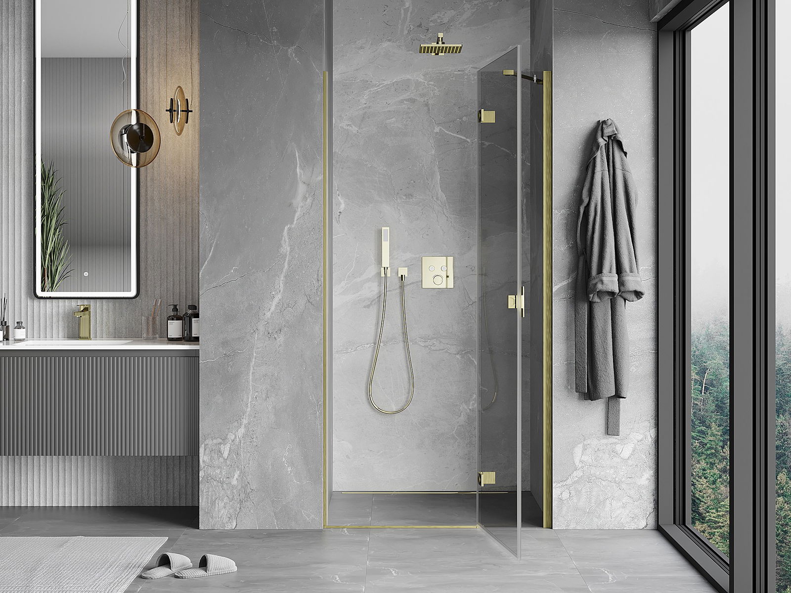 Praktická a pohodlná rukoväť je vyrobená z odolného a pevného kovu. Moderný tvar v kombinácii s povrchovou úpravou prispôsobenou farbe profilov dodáva celku moderný a štýlový vzhľad, zdôrazňujúc estetiku každej kúpeľne.