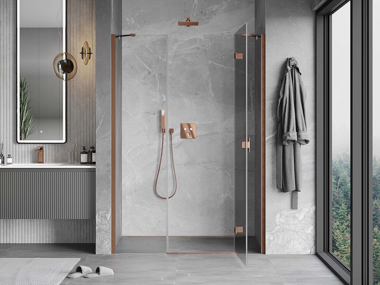 Praktická a pohodlná rukoväť je vyrobená z odolného a pevného kovu. Moderný tvar v kombinácii s povrchovou úpravou prispôsobenou farbe profilov dodáva celku moderný a štýlový vzhľad, zdôrazňujúc estetiku každej kúpeľne.