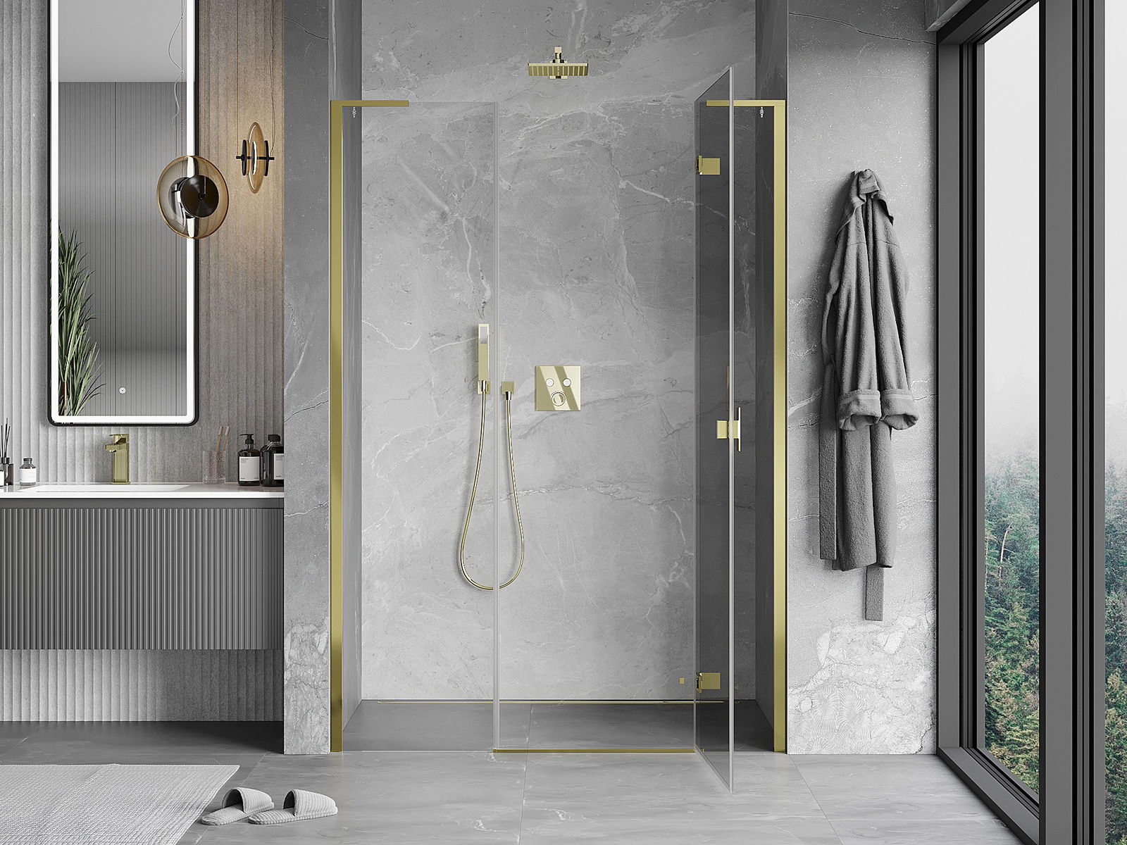 Praktická a pohodlná rukoväť je vyrobená z odolného a pevného kovu. Moderný tvar v kombinácii s povrchovou úpravou prispôsobenou farbe profilov dodáva celku moderný a štýlový vzhľad, zdôrazňujúc estetiku každej kúpeľne.