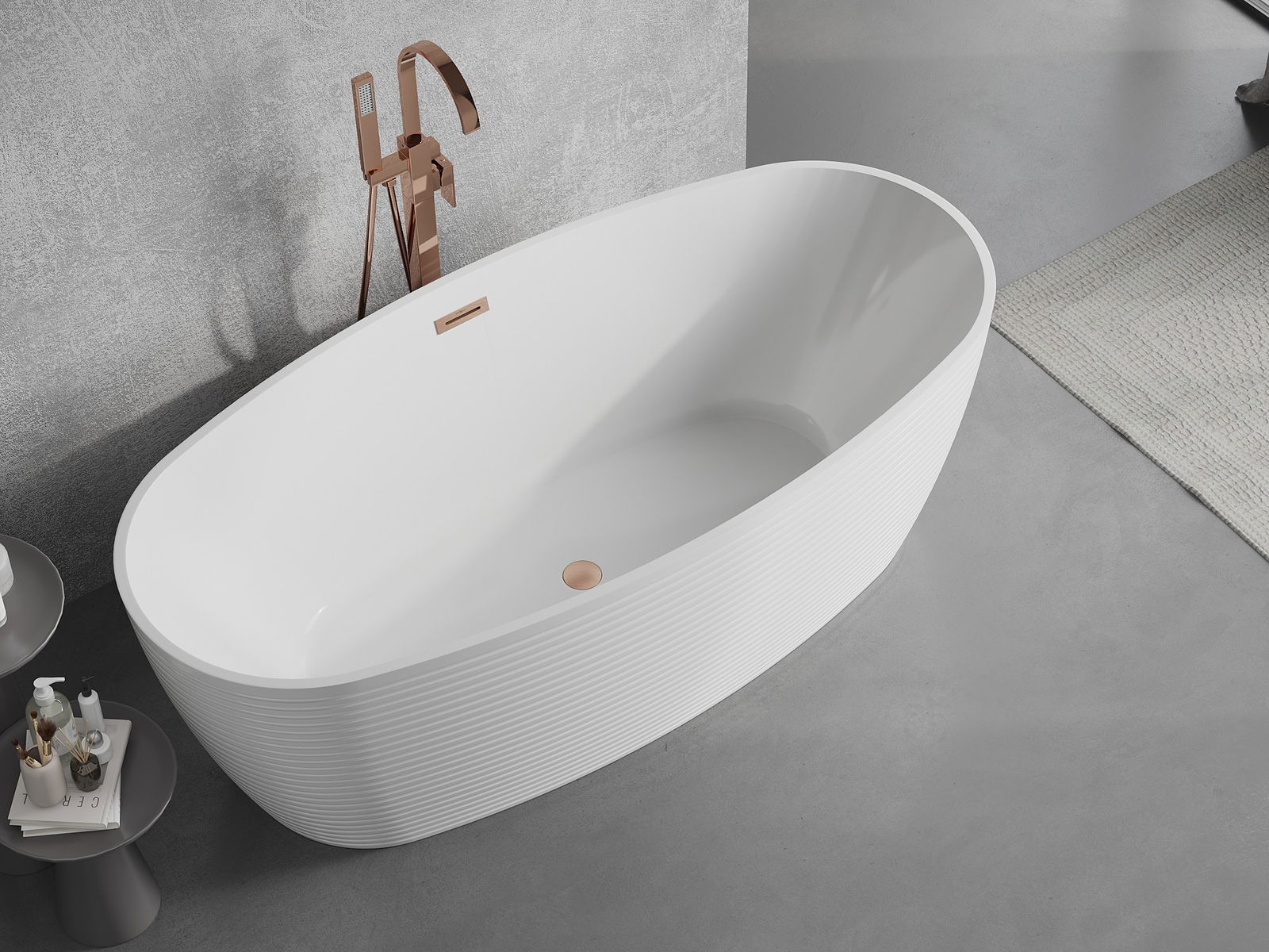 Je to moderný materiál, ktorý kombinuje elegantný vzhľad s vysokou trvanlivosťou. Je odolný proti mechanickému poškodeniu, ľahko sa čistí a je príjemný na dotyk. Transparentná forma a tenký okraj vane jej dodávajú ľahkosť a unikátny charakter, čím vytvárajú efektný prvok v usporiadaní kúpeľne.