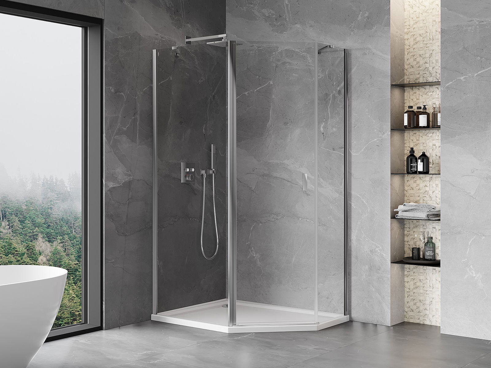 Mexen Mist asymetrická päťuholníková sprchová kabína s výkyvnými dverami 90 x 80 cm, priehľadná, chróm - 8A8-090-080-01-00