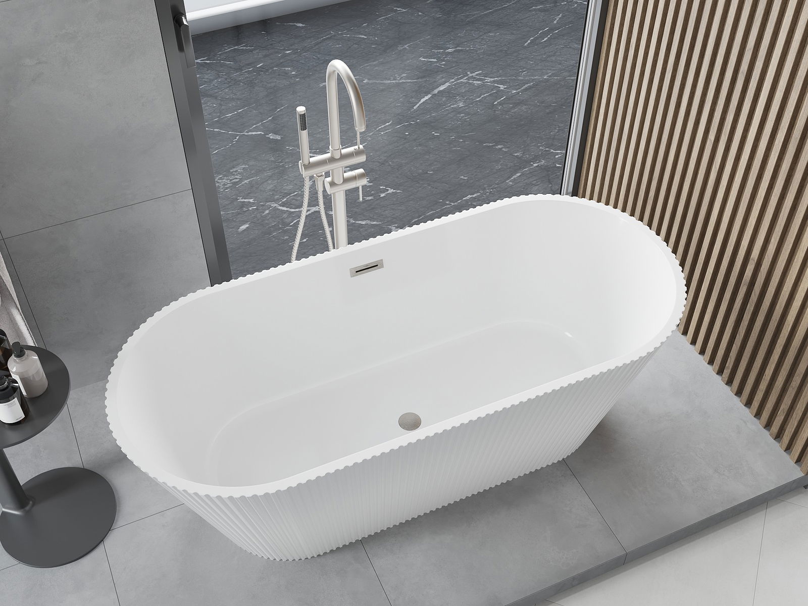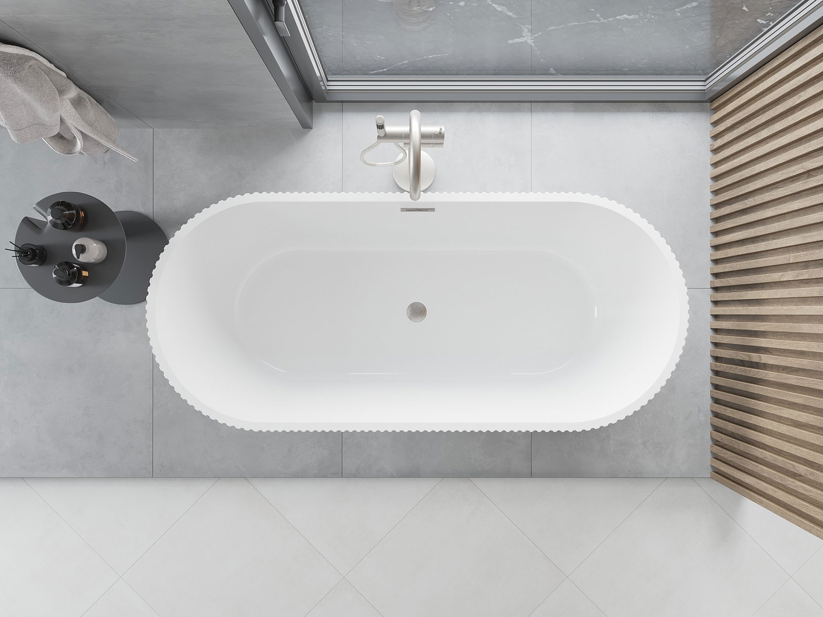 Je to moderný materiál, ktorý kombinuje elegantný vzhľad s vysokou trvanlivosťou. Je odolný proti mechanickému poškodeniu, ľahko sa čistí a je príjemný na dotyk. Transparentná forma a tenký okraj vane jej dodávajú ľahkosť a unikátny charakter, čím vytvárajú efektný prvok v usporiadaní kúpeľne.