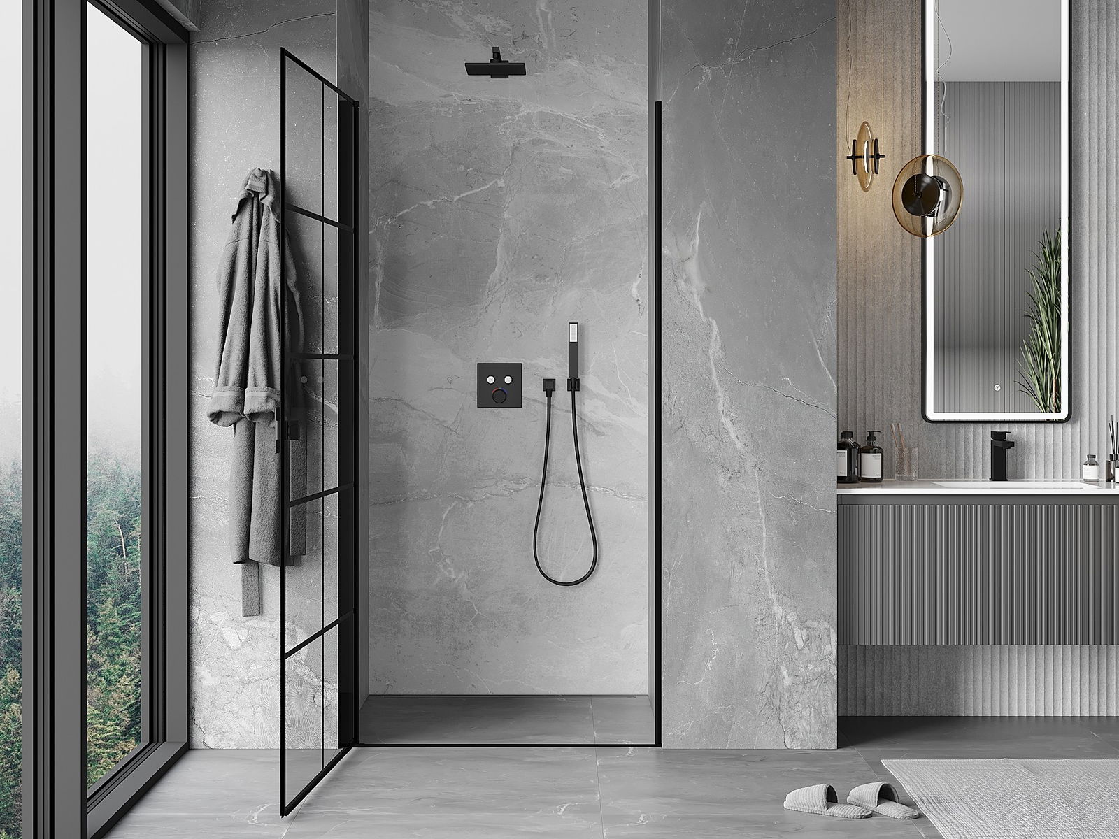 Praktická a pohodlná rukoväť je vyrobená z odolného a pevného kovu. Moderný tvar v kombinácii s povrchovou úpravou prispôsobenou farbe profilov dodáva celku moderný a štýlový vzhľad, zdôrazňujúc estetiku každej kúpeľne.
