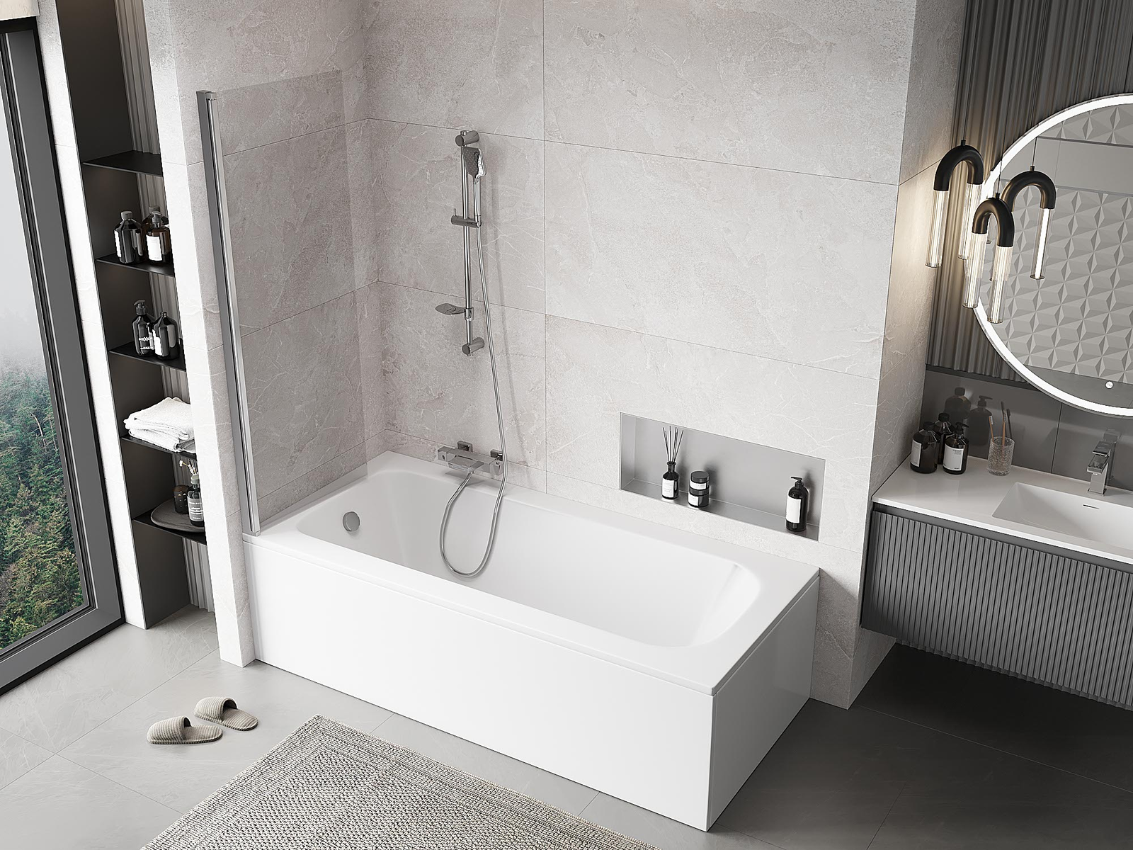 Paraván má jedno pohyblivé krídlo s možnosťou zloženia. Takéto riešenie umožňuje ušetriť viac miesta v kúpeľni a umožňuje voľné využívanie zvyšného priestoru, keď nepoužívame kúpeľňovú zónu.
