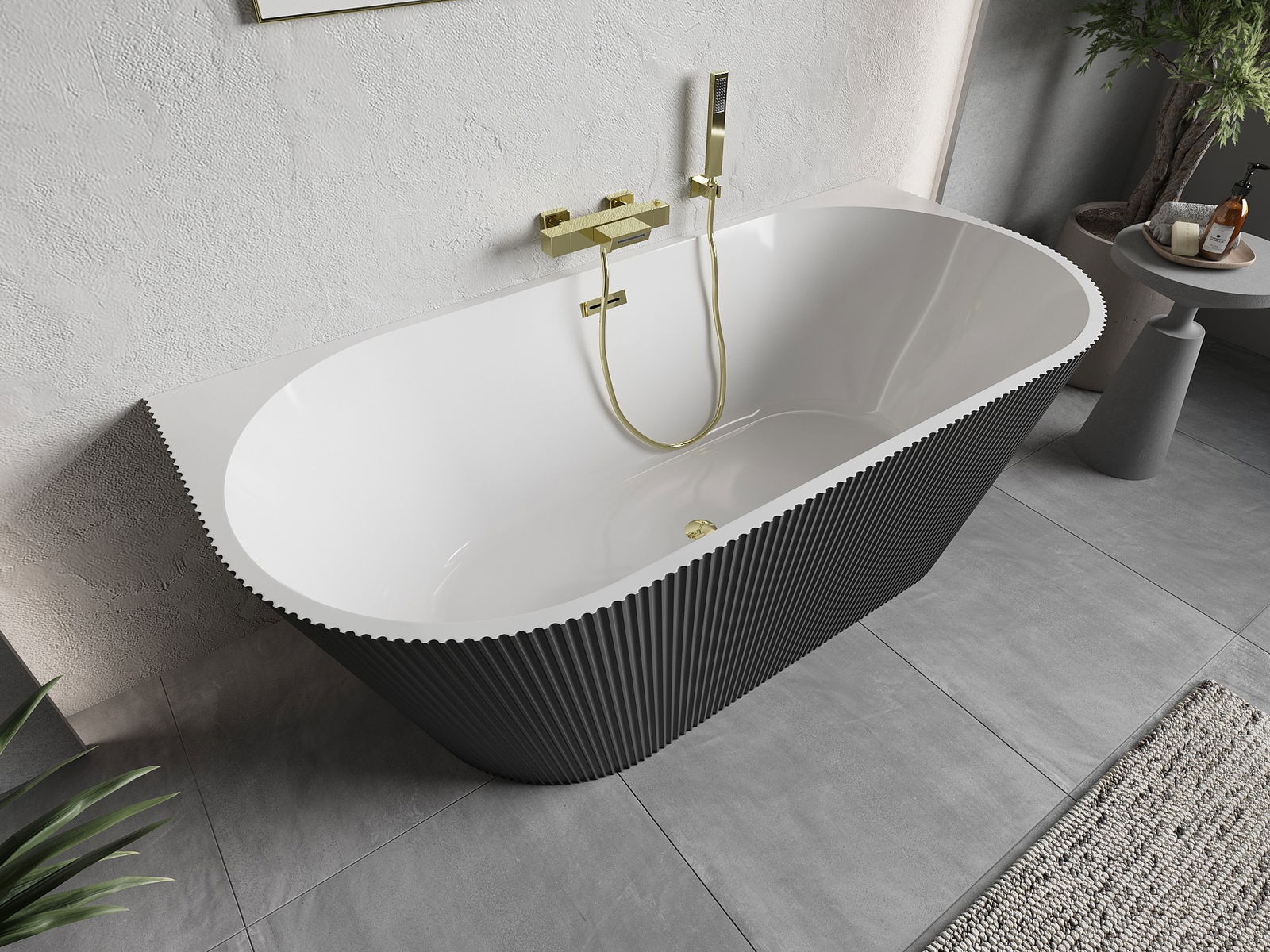 Mexen Oris wanna voľne stojaca pri stene ryhovaná 150 x 75 cm, biela/sivá, prepad zlatý - 52871507562-50