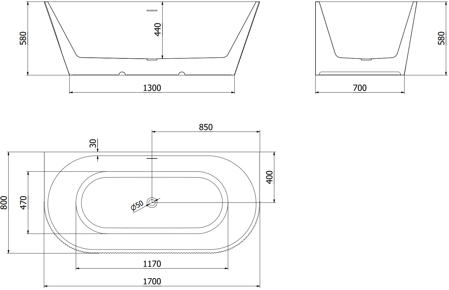 Mexen Oris voľne stojaca pri stene ryhovaná vaňa 170 x 80 cm, biela, prepad zlatý brúsený - 52871708000-55