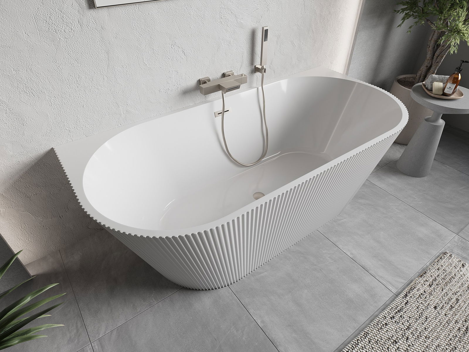 Je to moderný materiál, ktorý kombinuje elegantný vzhľad s vysokou trvanlivosťou. Je odolný proti mechanickému poškodeniu, ľahko sa čistí a je príjemný na dotyk. Transparentná forma a tenký okraj vane jej dodávajú ľahkosť a unikátny charakter, čím vytvárajú efektný prvok v usporiadaní kúpeľne.