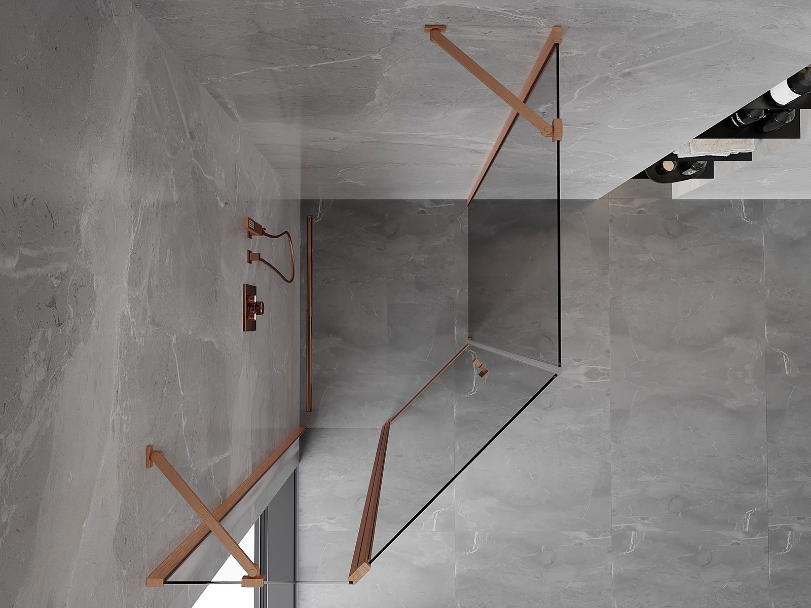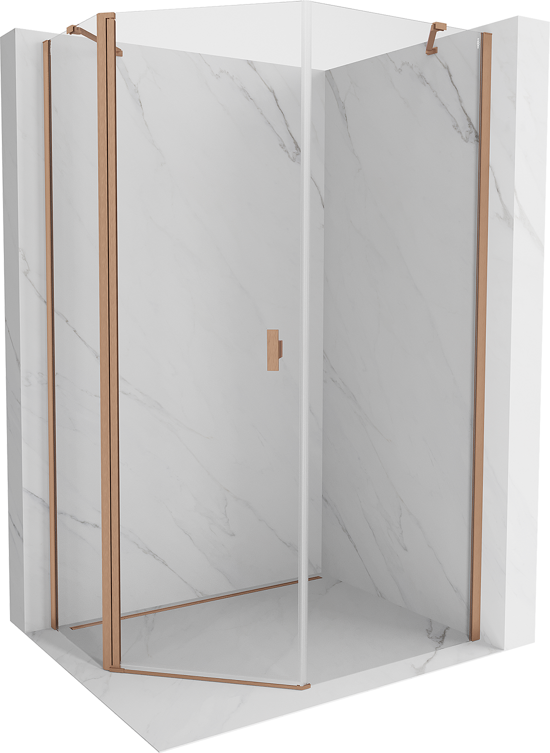 Mexen Mist asymetrická päťuholníková sprchová kabína s otváracími dverami 80 x 90 cm, transparentná, brúsená meď