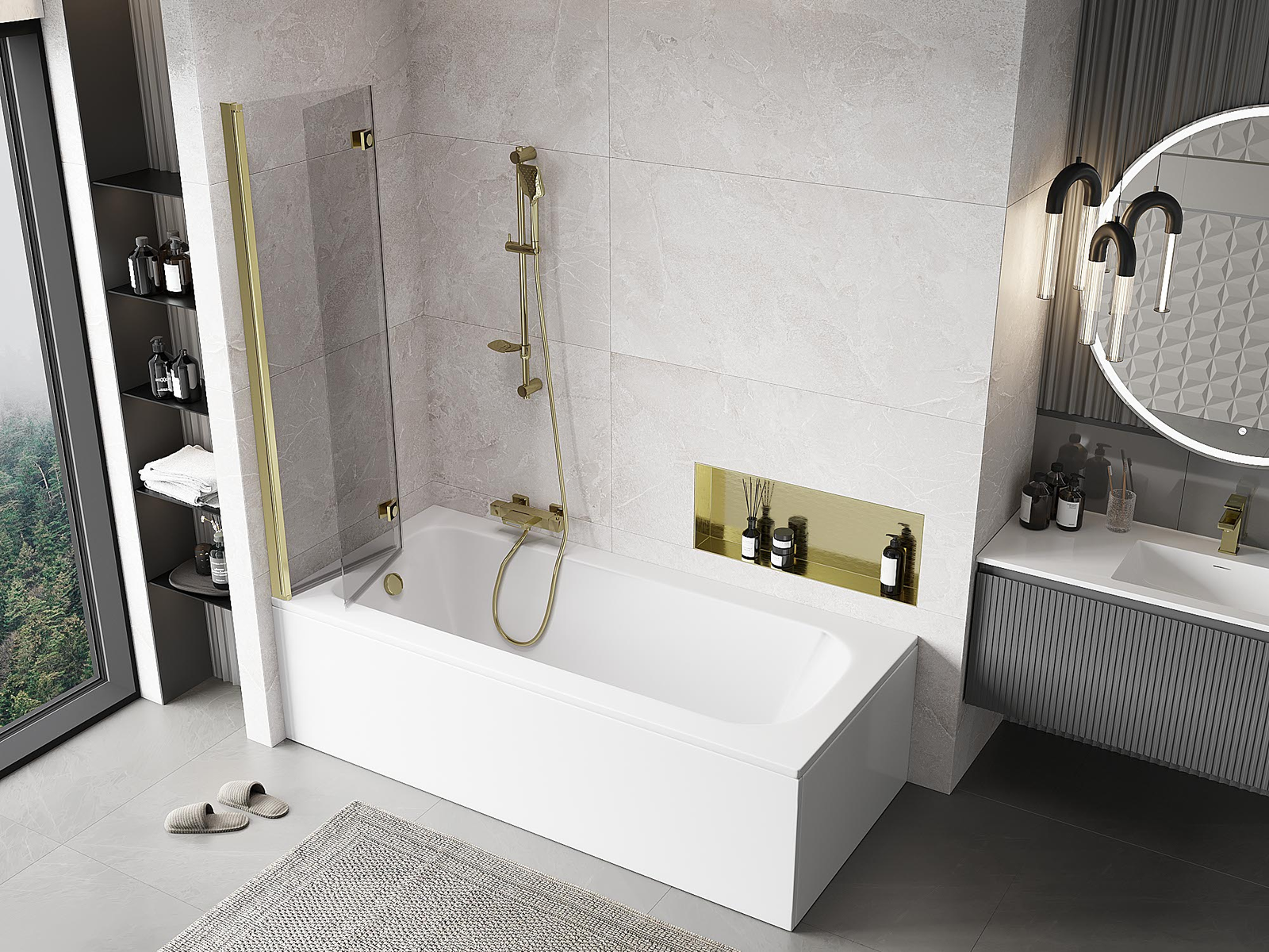Paraván vyrobený z dvoch krídel s možnosťou zloženia. Takéto riešenie umožňuje ušetriť viac miesta v kúpeľni a umožňuje voľné využitie zvyšného priestoru, keď nepoužívame kúpeľnú zónu.