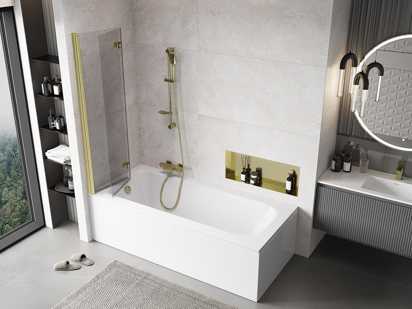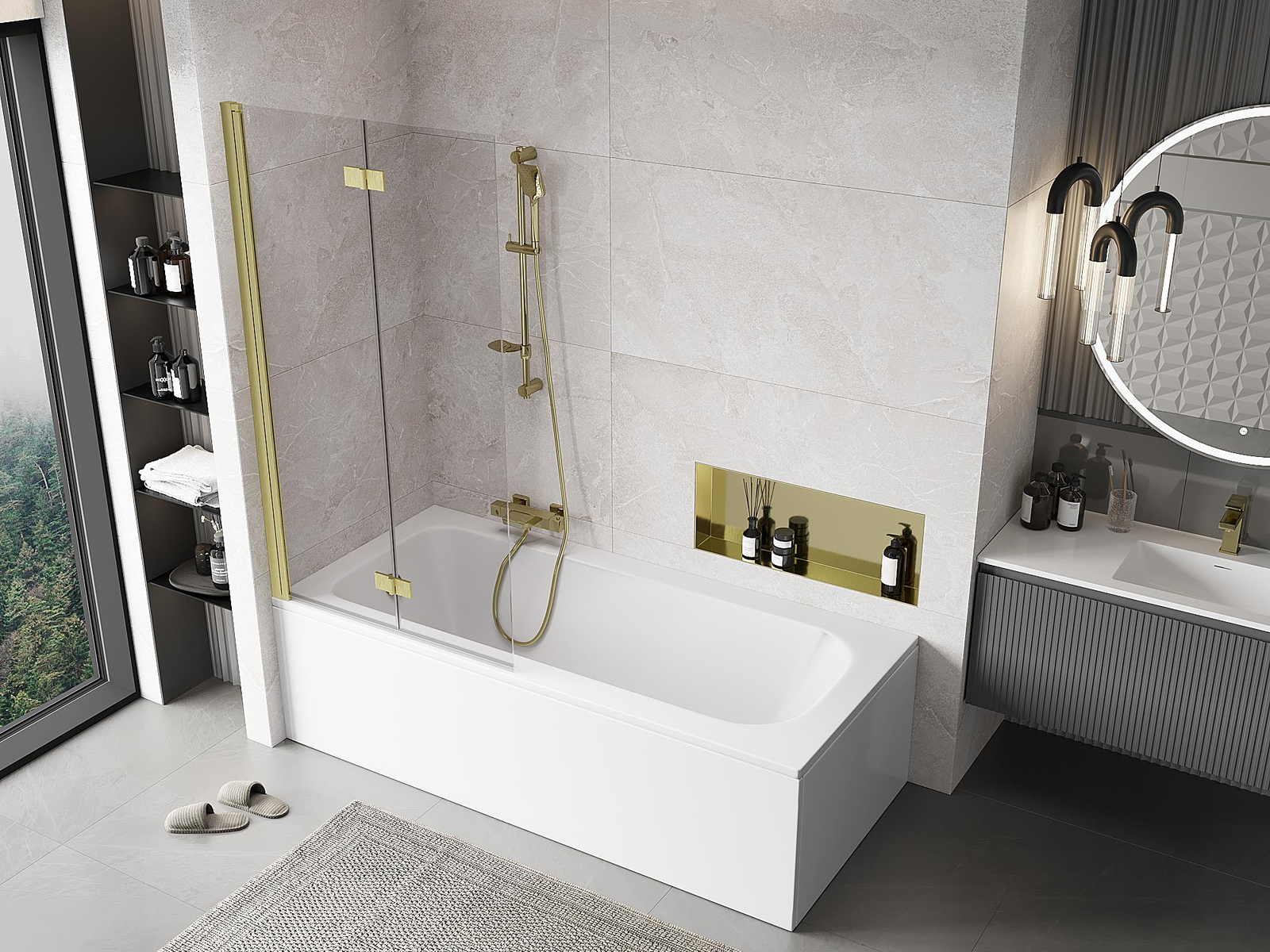 Paraván vyrobený z dvoch krídel s možnosťou zloženia. Takéto riešenie umožňuje ušetriť viac miesta v kúpeľni a umožňuje voľné využitie zvyšného priestoru, keď nepoužívame kúpeľnú zónu.