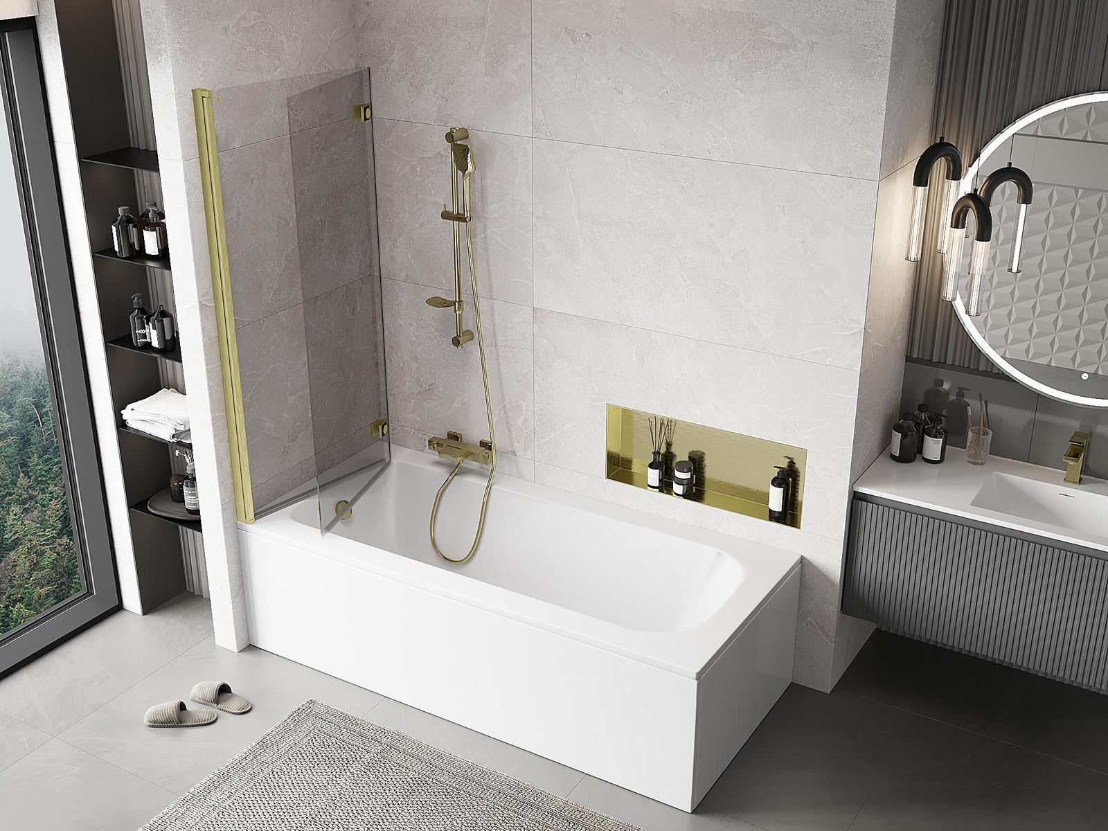 Paraván vyrobený z dvoch krídel s možnosťou zloženia. Takéto riešenie umožňuje ušetriť viac miesta v kúpeľni a umožňuje voľné využitie zvyšného priestoru, keď nepoužívame kúpeľnú zónu.