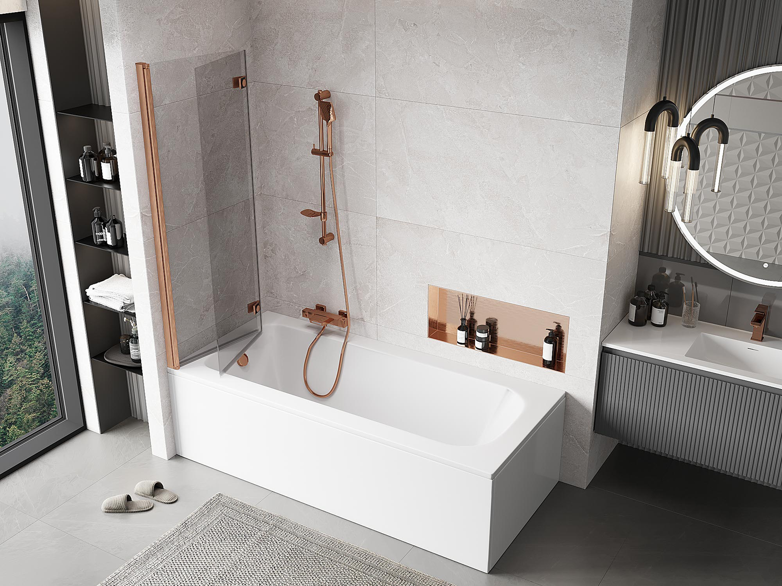 Paraván vyrobený z dvoch krídel s možnosťou zloženia. Takéto riešenie umožňuje ušetriť viac miesta v kúpeľni a umožňuje voľné využitie zvyšného priestoru, keď nepoužívame kúpeľnú zónu.