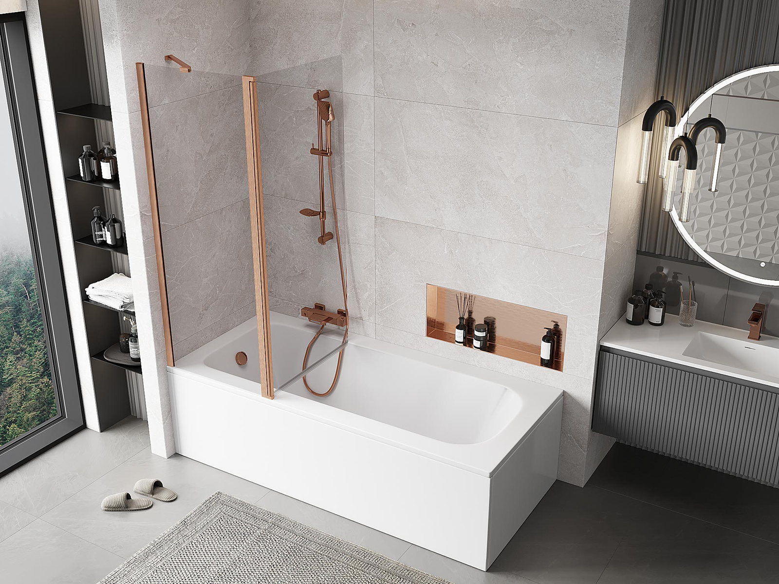 Paraván vyrobený z dvoch krídel s možnosťou zloženia. Takéto riešenie umožňuje ušetriť viac miesta v kúpeľni a umožňuje voľné využitie zvyšného priestoru, keď nepoužívame kúpeľnú zónu.