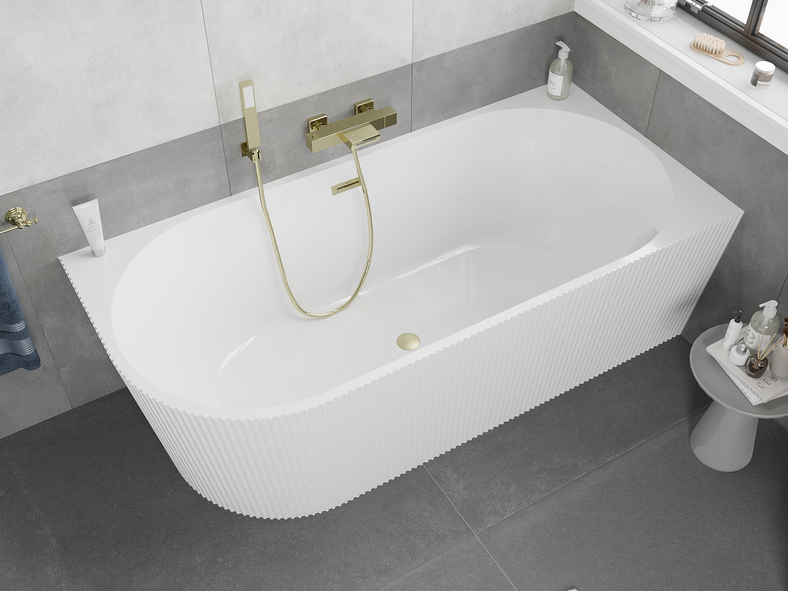 Mexen Silo voľne stojaca rohová vaňa pravá, ryhovaná 150 x 75 cm, biela, preliv zlatý kartáčovaný - 52891507500P-55