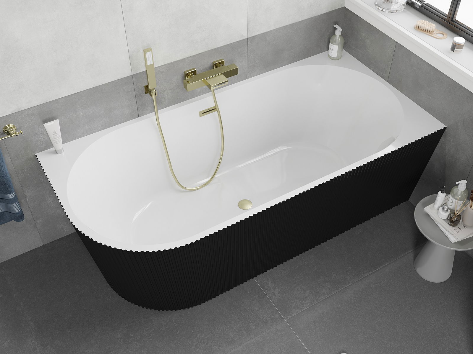 Mexen Silo voľne stojaca rohová pravá ryhovaná vaňa 150 x 75 cm, biela/čierna, prepad zlatý leštený - 52891507575P-55