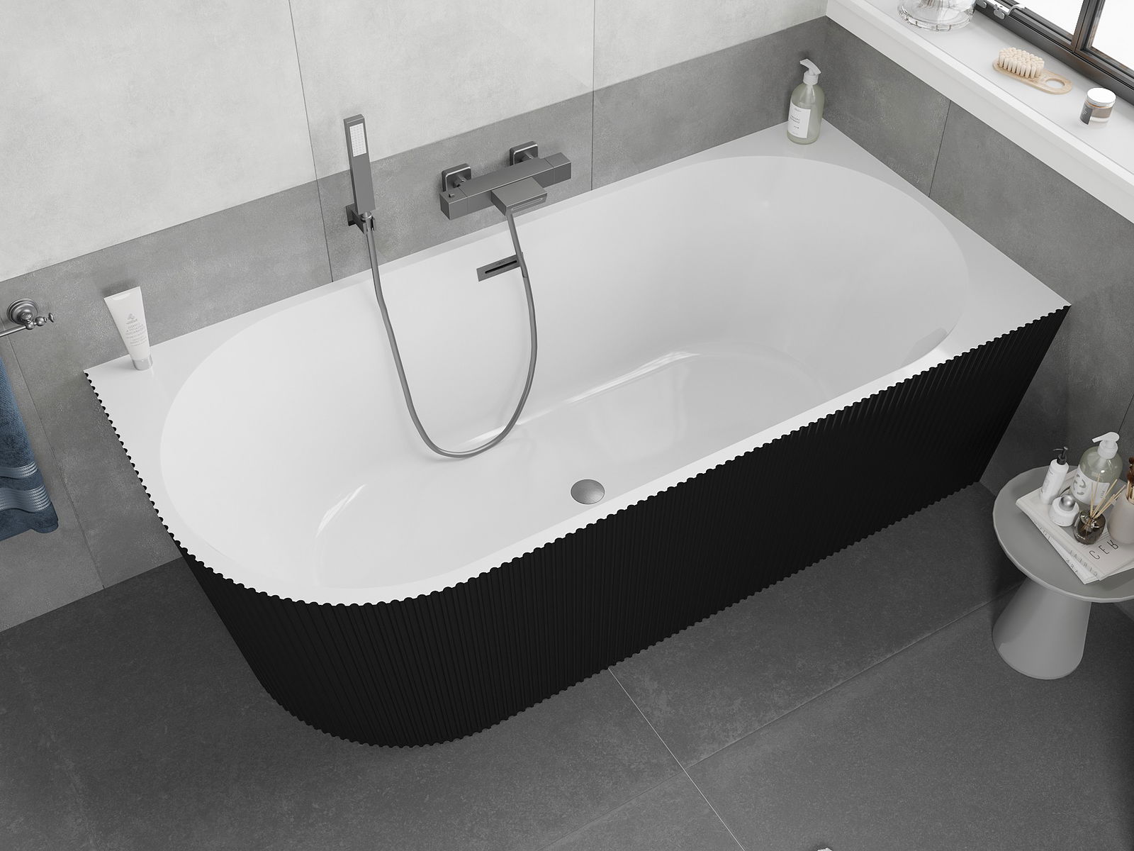 Mexen Silo rohová voľne stojaca vaňa pravá, ryhovaná 150 x 75 cm, biela/čierna, prepad gun gray brúsený