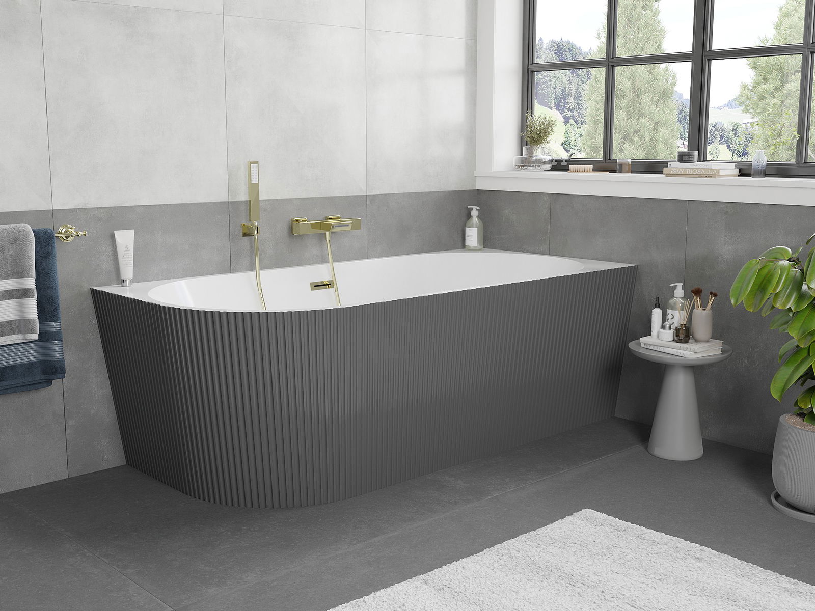 Mexen Silo voľne stojaca rohová pravá ryhovaná vaňa 150 x 75 cm, biela/sivá, preliv zlatý - 52891507562P-50