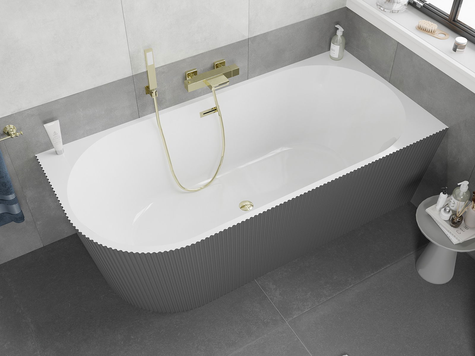 Mexen Silo voľne stojaca rohová vaňa pravá ryhovaná 170 x 80 cm, biela/sivá, prepad zlatý - 52891708062P-50