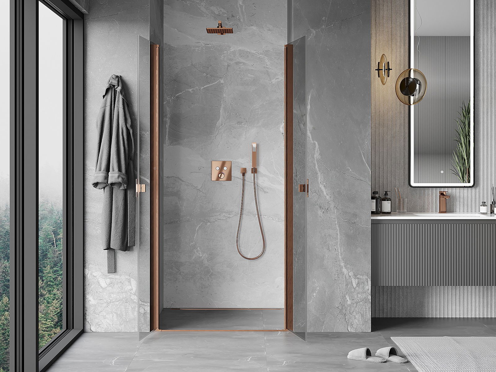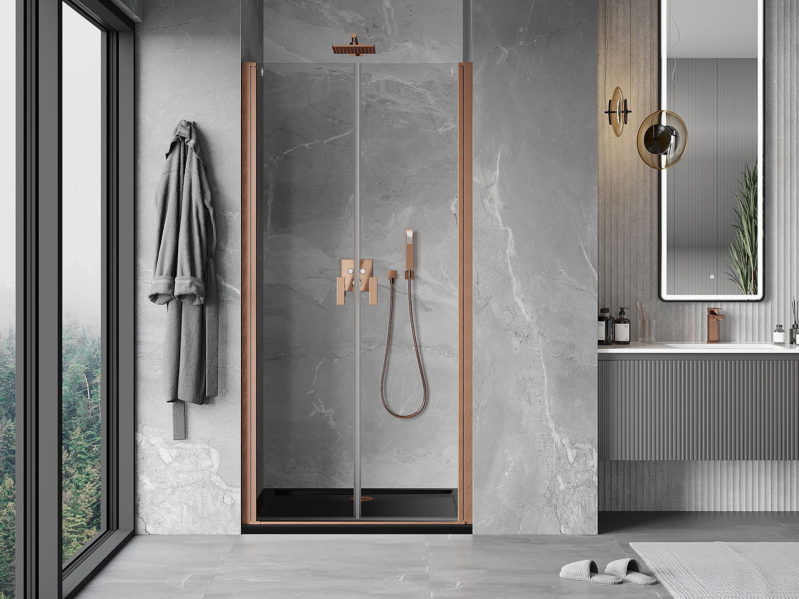 Praktická a pohodlná rukoväť je vyrobená z odolného a pevného kovu. Moderný tvar v kombinácii s povrchovou úpravou prispôsobenou farbe profilov dodáva celku moderný a štýlový vzhľad, zdôrazňujúc estetiku každej kúpeľne.