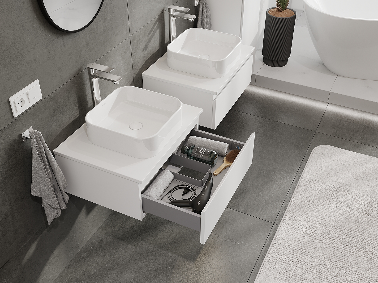 Výrez v zásuvke je navrhnutý tak, aby pojal sifón, ktorý je nevyhnutný v umývadlových inštaláciách. Vďaka tomu môže byť nábytok namontovaný plne funkčne, bez nutnosti vzdávať sa priestoru v zásuvke v prospech inštalácie.