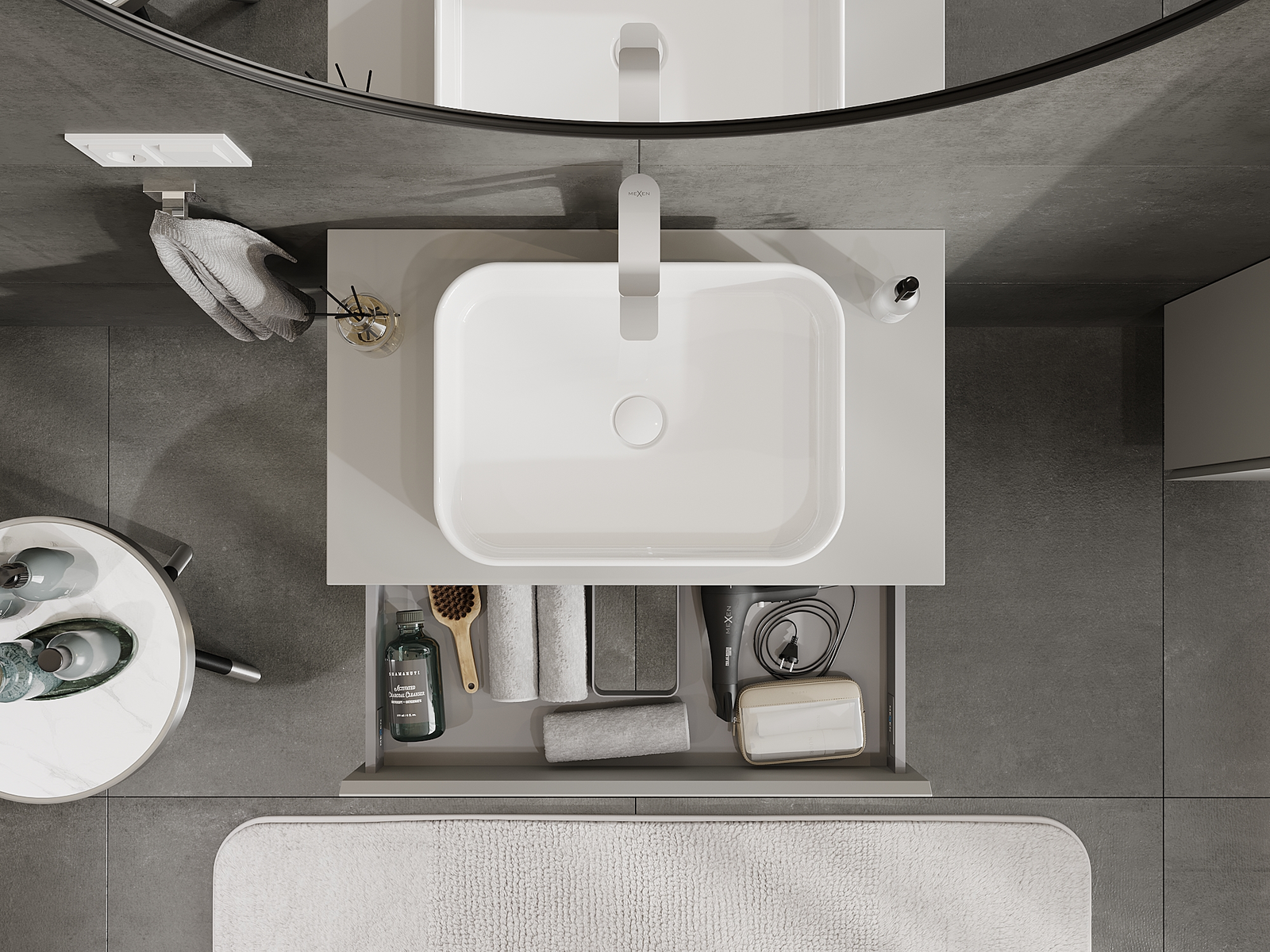 Výrez v zásuvke je navrhnutý tak, aby pojal sifón, ktorý je nevyhnutný v umývadlových inštaláciách. Vďaka tomu môže byť nábytok namontovaný plne funkčne, bez nutnosti vzdávať sa priestoru v zásuvke v prospech inštalácie.