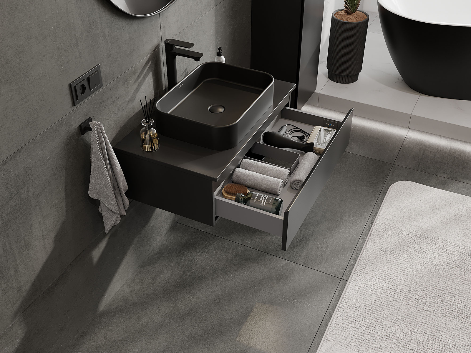 Výrez v zásuvke je navrhnutý tak, aby pojal sifón, ktorý je nevyhnutný v umývadlových inštaláciách. Vďaka tomu môže byť nábytok namontovaný plne funkčne, bez nutnosti vzdávať sa priestoru v zásuvke v prospech inštalácie.