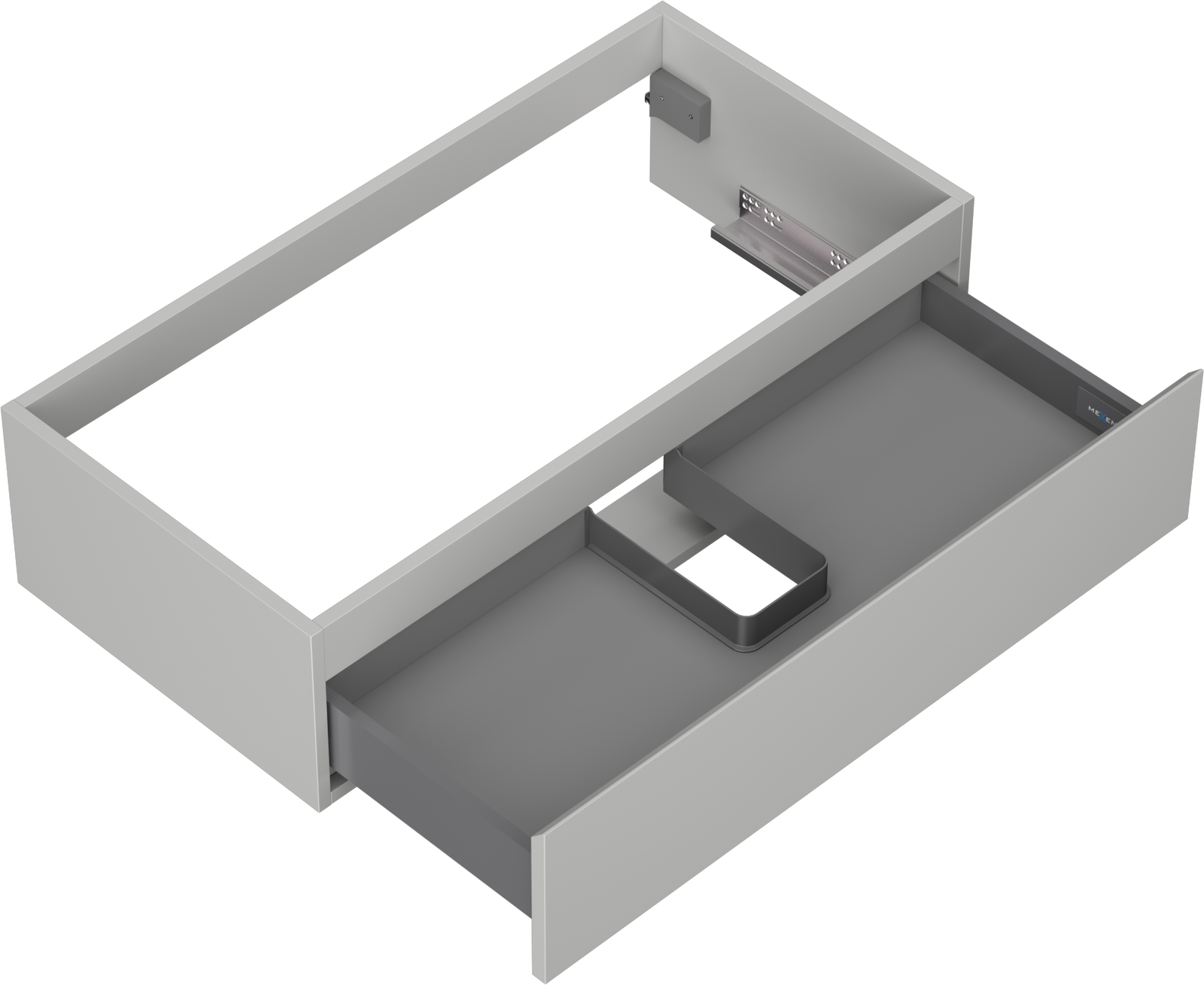 Výrez v zásuvke je navrhnutý tak, aby pojal sifón, ktorý je nevyhnutný v umývadlových inštaláciách. Vďaka tomu môže byť nábytok namontovaný plne funkčne, bez nutnosti vzdávať sa priestoru v zásuvke v prospech inštalácie.