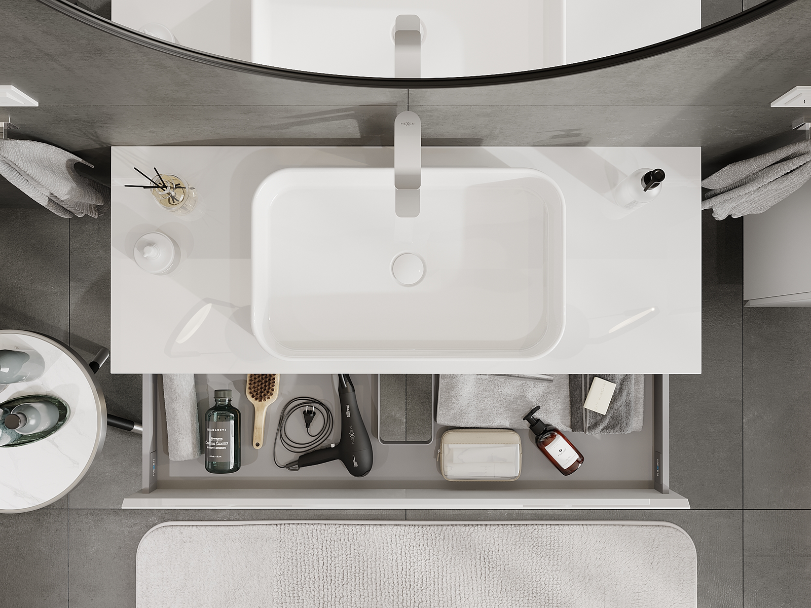 Výrez v zásuvke je navrhnutý tak, aby pojal sifón, ktorý je nevyhnutný v umývadlových inštaláciách. Vďaka tomu môže byť nábytok namontovaný plne funkčne, bez nutnosti vzdávať sa priestoru v zásuvke v prospech inštalácie.