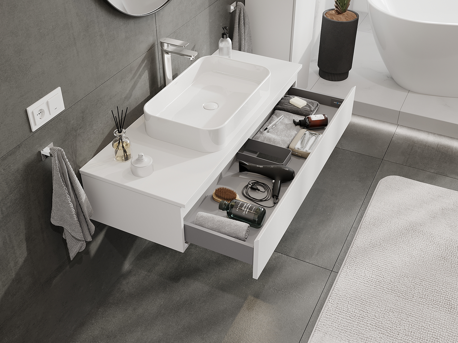 Výrez v zásuvke je navrhnutý tak, aby pojal sifón, ktorý je nevyhnutný v umývadlových inštaláciách. Vďaka tomu môže byť nábytok namontovaný plne funkčne, bez nutnosti vzdávať sa priestoru v zásuvke v prospech inštalácie.