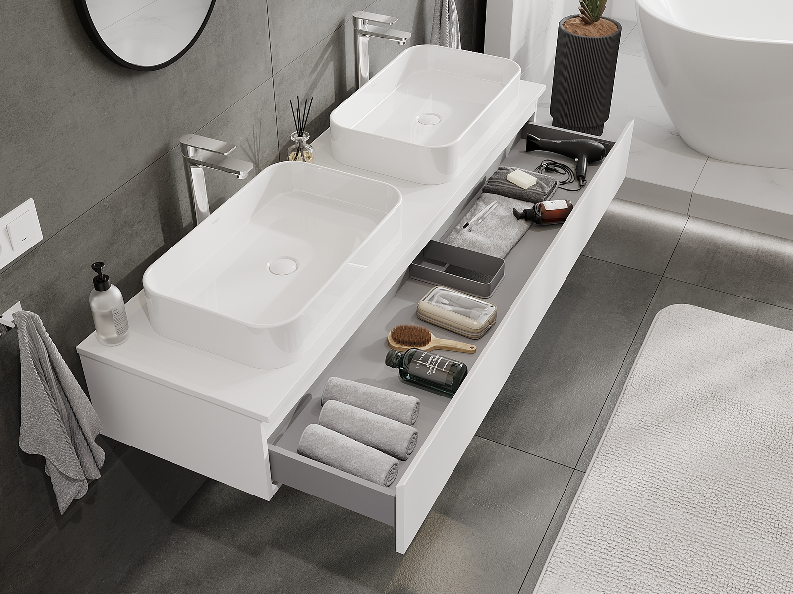Výrez v zásuvke je navrhnutý tak, aby pojal sifón, ktorý je nevyhnutný v umývadlových inštaláciách. Vďaka tomu môže byť nábytok namontovaný plne funkčne, bez nutnosti vzdávať sa priestoru v zásuvke v prospech inštalácie.