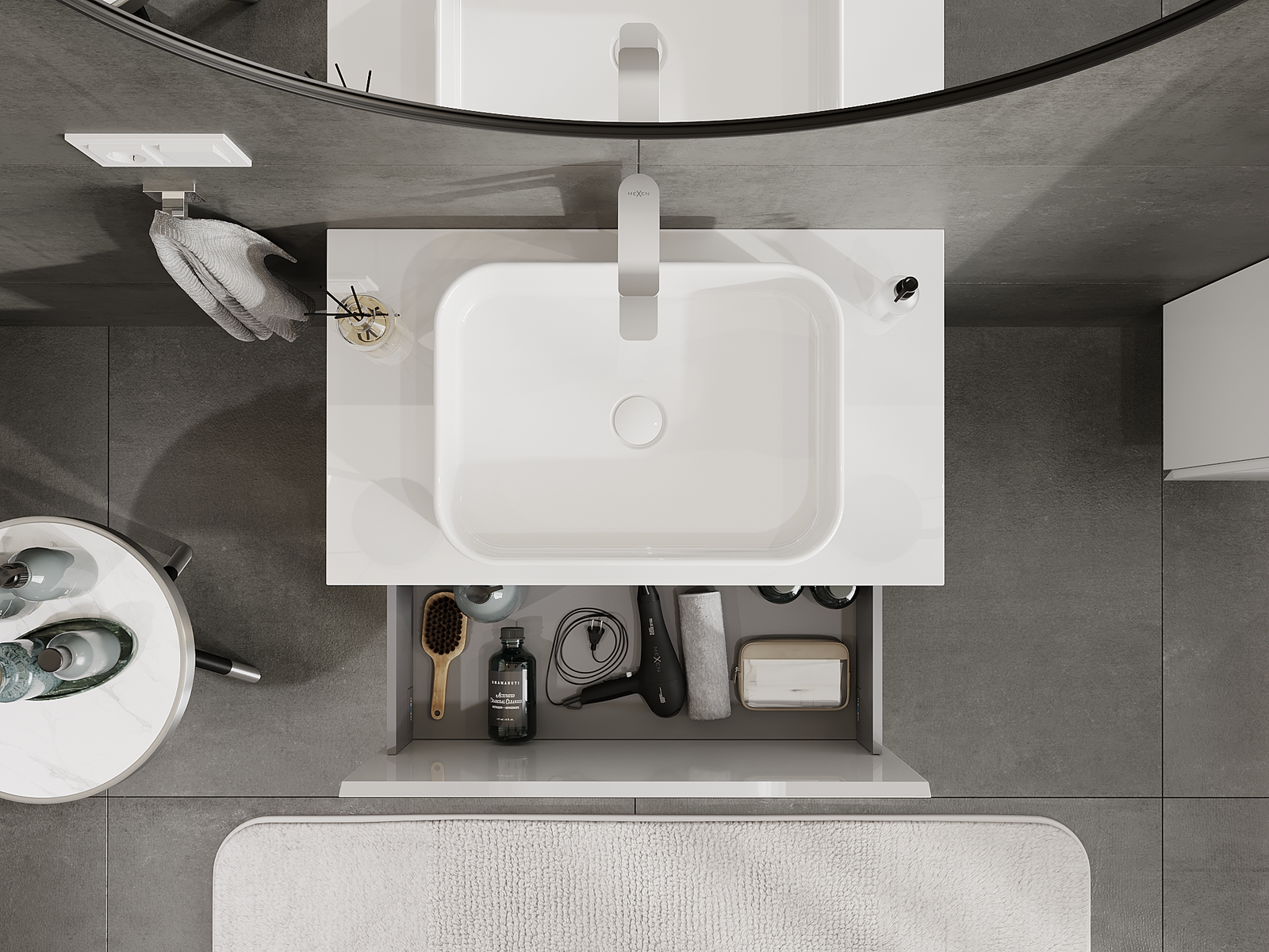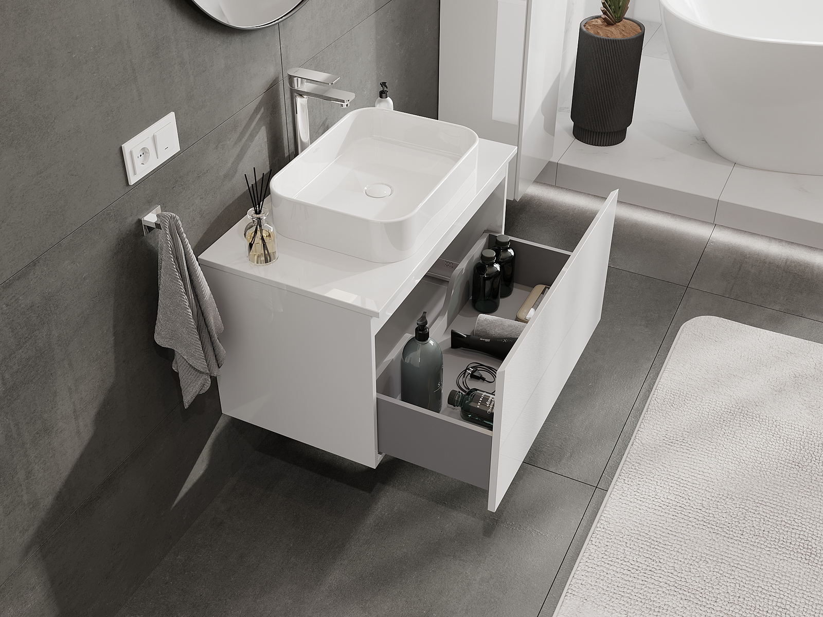 Výrez v zásuvke je navrhnutý tak, aby pojal sifón, ktorý je nevyhnutný v umývadlových inštaláciách. Vďaka tomu môže byť nábytok namontovaný plne funkčne, bez nutnosti vzdávať sa priestoru v zásuvke v prospech inštalácie.