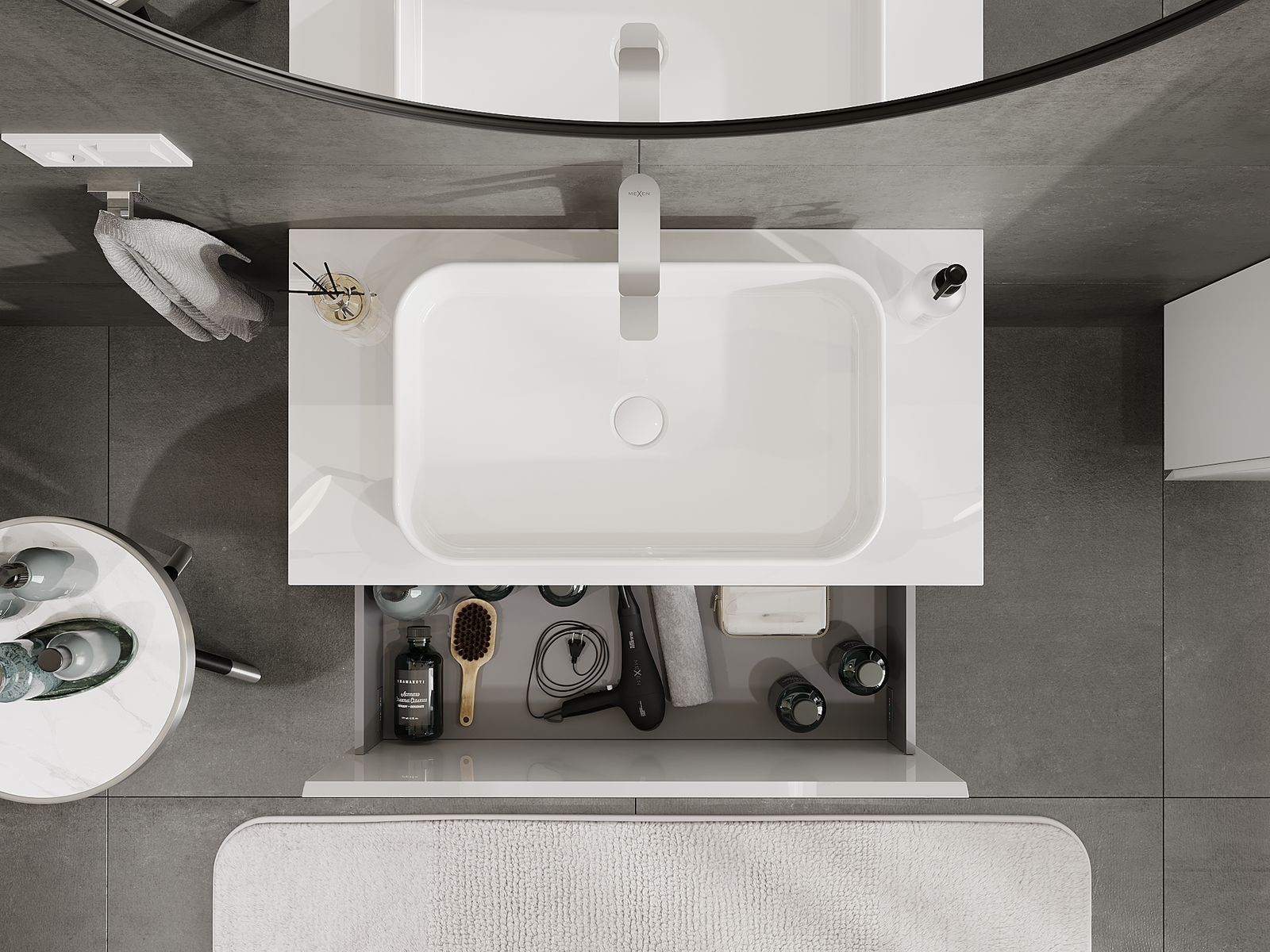 Výrez v zásuvke je navrhnutý tak, aby pojal sifón, ktorý je nevyhnutný v umývadlových inštaláciách. Vďaka tomu môže byť nábytok namontovaný plne funkčne, bez nutnosti vzdávať sa priestoru v zásuvke v prospech inštalácie.