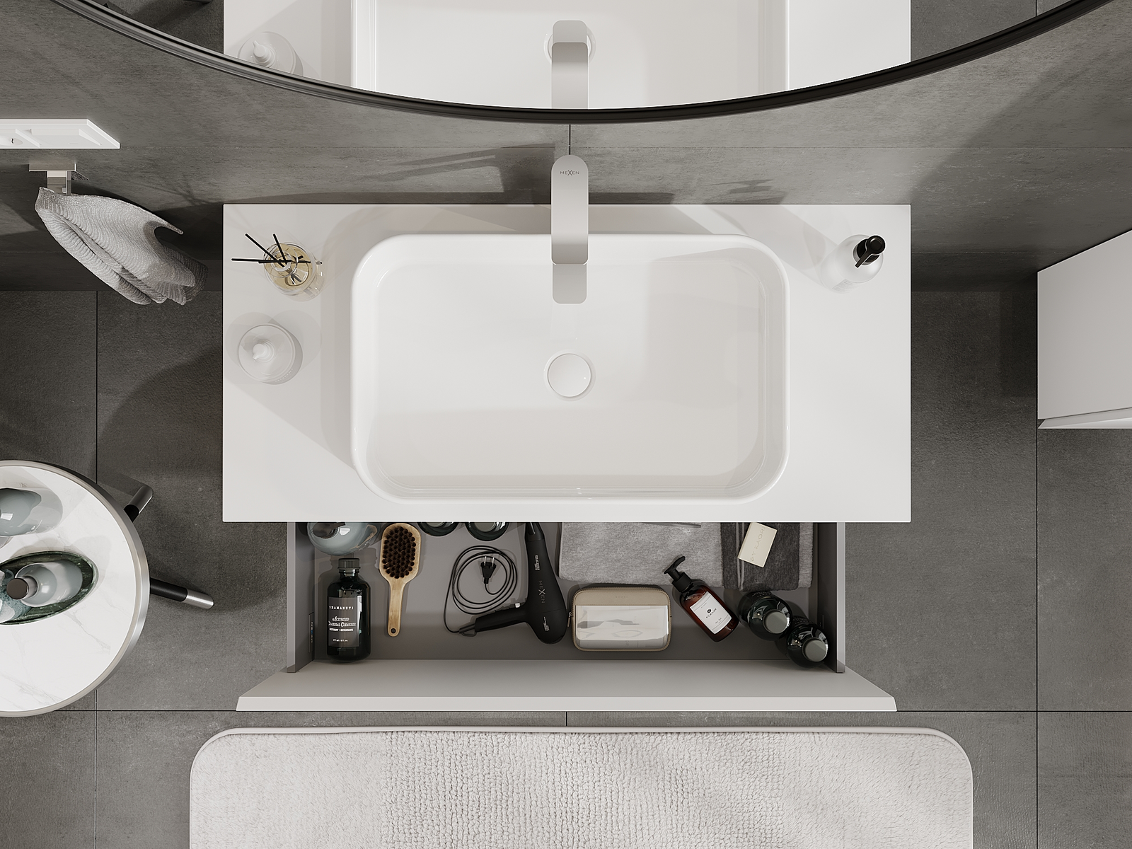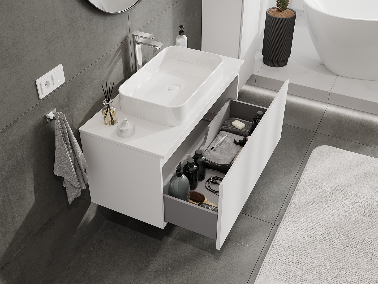 Výrez v zásuvke je navrhnutý tak, aby pojal sifón, ktorý je nevyhnutný v umývadlových inštaláciách. Vďaka tomu môže byť nábytok namontovaný plne funkčne, bez nutnosti vzdávať sa priestoru v zásuvke v prospech inštalácie.