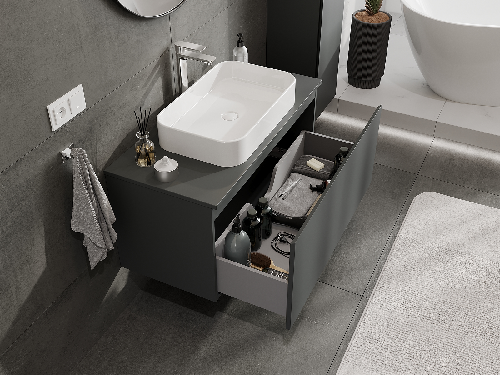 Výrez v zásuvke je navrhnutý tak, aby pojal sifón, ktorý je nevyhnutný v umývadlových inštaláciách. Vďaka tomu môže byť nábytok namontovaný plne funkčne, bez nutnosti vzdávať sa priestoru v zásuvke v prospech inštalácie.