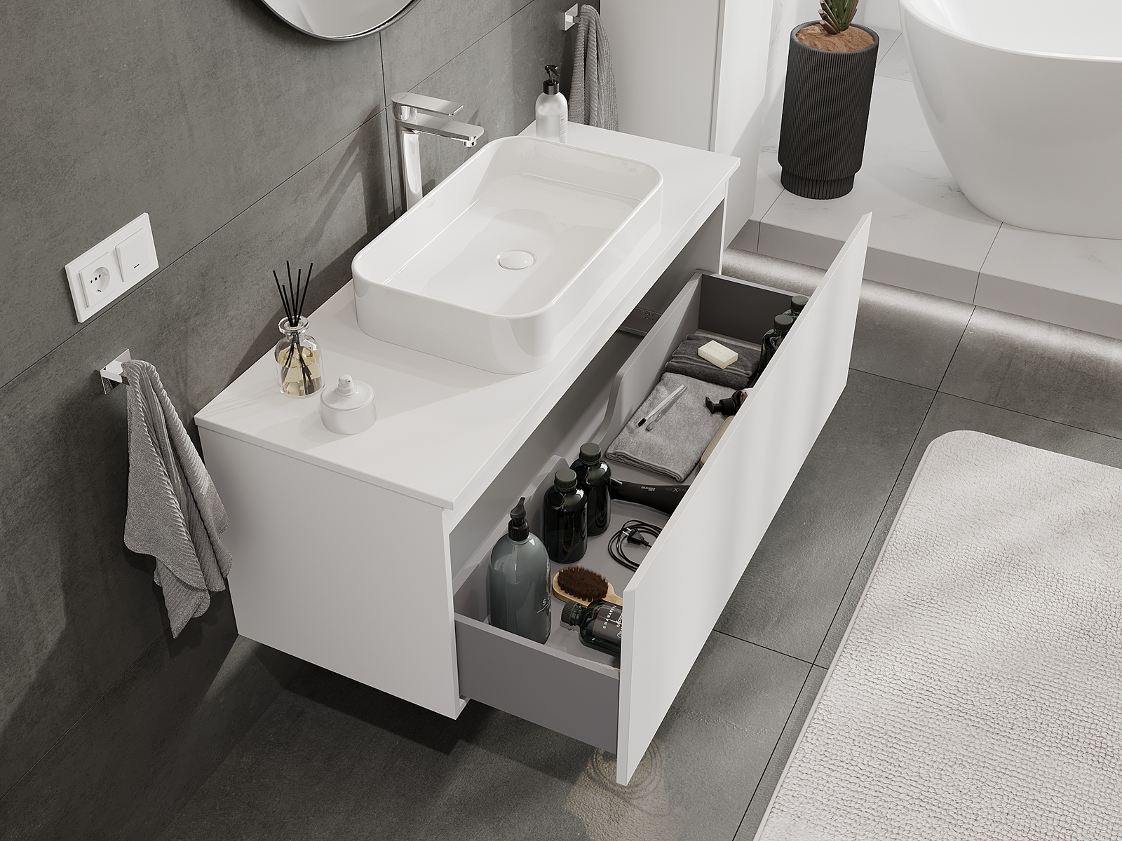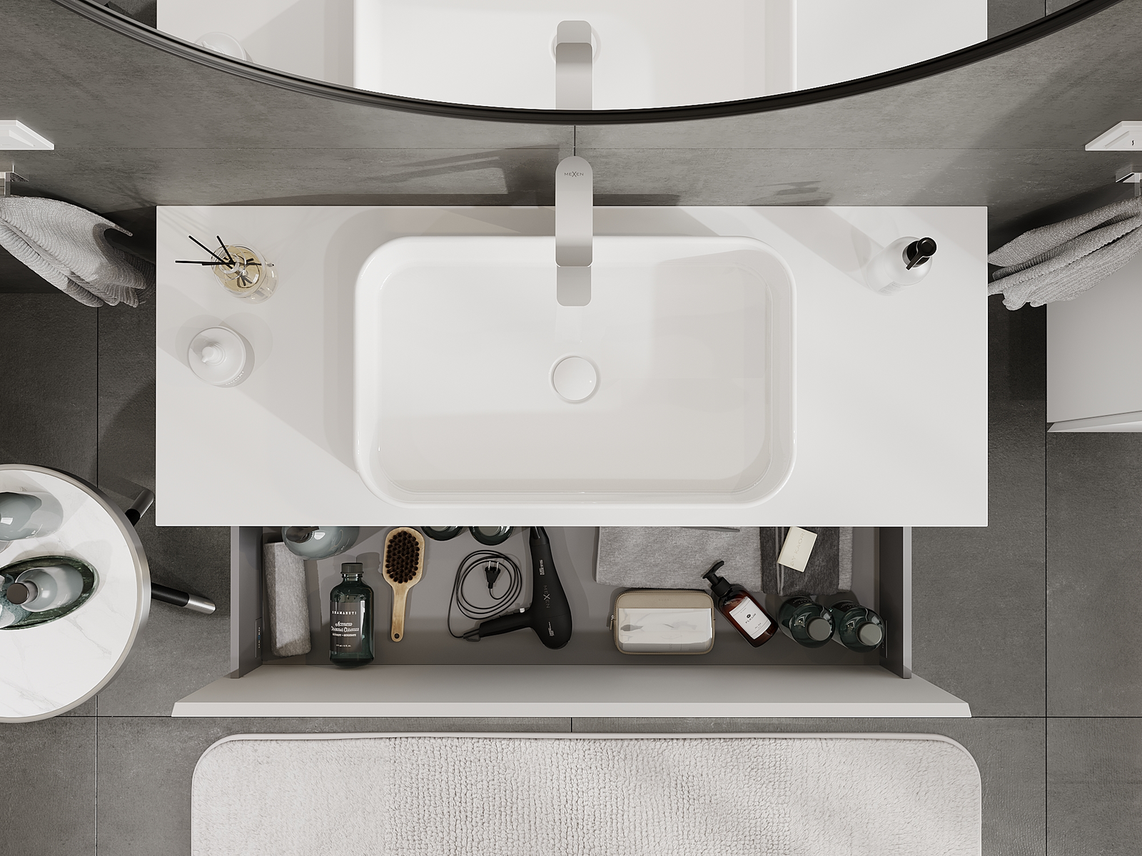 Výrez v zásuvke je navrhnutý tak, aby pojal sifón, ktorý je nevyhnutný v umývadlových inštaláciách. Vďaka tomu môže byť nábytok namontovaný plne funkčne, bez nutnosti vzdávať sa priestoru v zásuvke v prospech inštalácie.